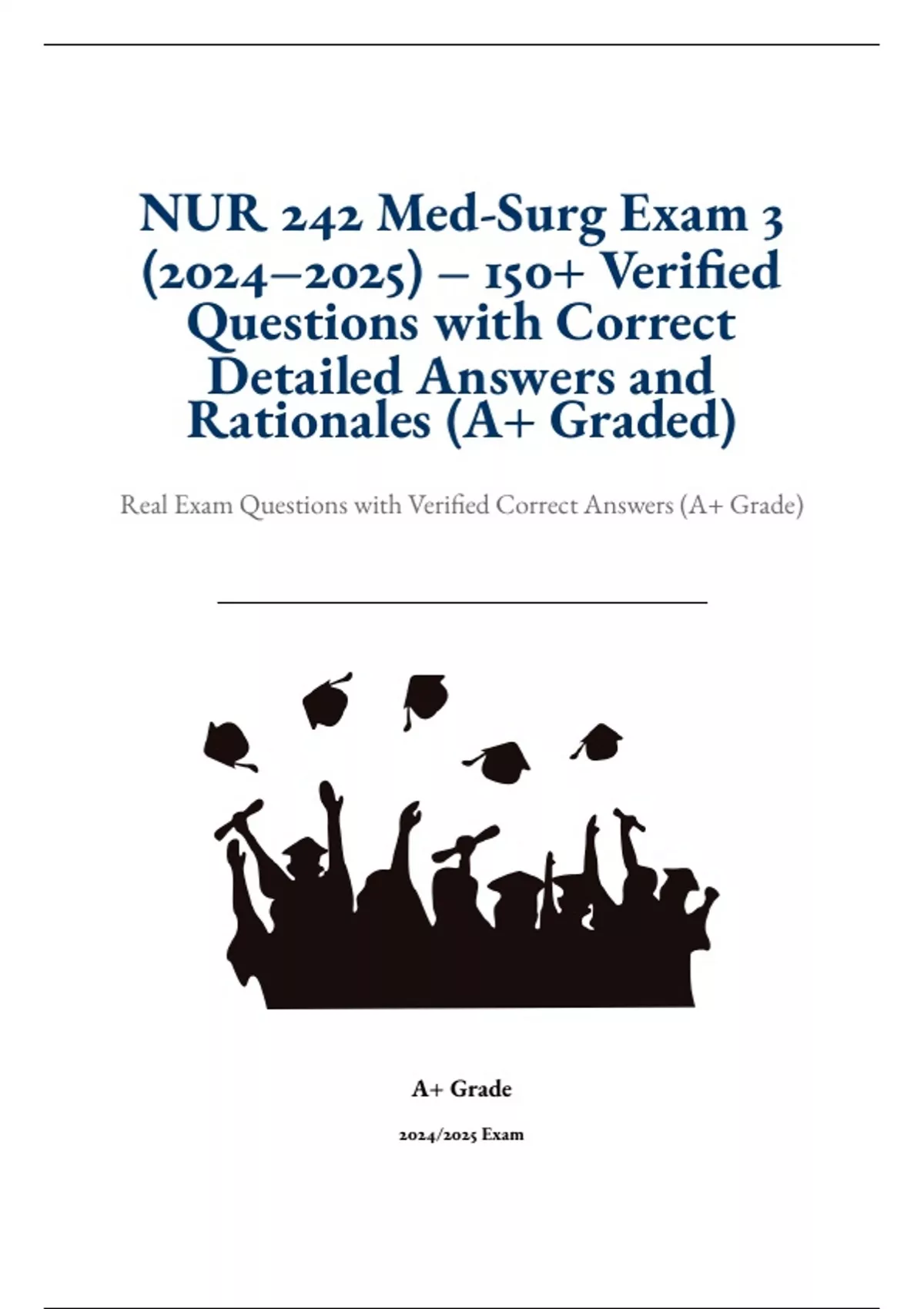 Prepare for the NUR 242 Med-Surg Exam 3 with this expertly curated resource designed for the 2024–2025 edition. Featuring 150+ actual exam questions, along with verified correct answers and detailed rationales, this guide ensures a comprehensive understanding of medical-surgical nursing concepts. Already graded A+, it is the perfect tool for achieving academic success. Key Features: 150+ real exam questions that mirror the latest NUR 242 curriculum. Verified correct answers with detailed rationales for deeper learning. Comprehensive coverage of medical-surgical nursing topics and concepts. Perfect for students aiming for A+ performance and exam confidence. This resource is your ultimate companion for mastering the Med-Surg Exam 3 and excelling in your nursing program. Don’t leave your success to chance—start preparing today!