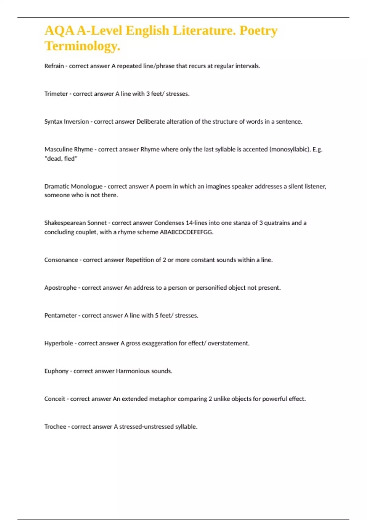 Pentameter - correct answer A line with 5 feet/ stresses.