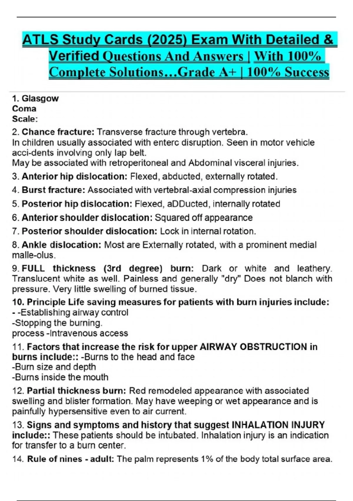 1. Glasgow Coma Scale: 2. Chance fracture: Transverse fracture through vertebra. In children usually associated with enterc disruption. Seen in motor vehicle acci-dents involving only lap belt. May be associated with retroperitoneal and Abdominal visceral injuries. 3. Anterior hip dislocation: Flexed, abducted, externally rotated. 4. Burst fracture: Associated with vertebral-axial compression injuries 5. Posterior hip dislocation: Flexed, aDDucted, internally rotated 6. Anterior shoulder dislocation: Squared off appearance 7. Posterior shoulder dislocation: Lock in internal rotation. 8. Ankle dislocation: Most are Externally rotated, with a prominent medial malle-olus. 9. FULL thickness (3rd degree) burn: Dark or white and leathery. Translucent white as well. Painless and generally "dry" Does not blanch with pressure. Very little swelling of burned tissue. 10. Principle Life saving measures for patients with burn injuries include: - -Establishing airway control -Stopping the burning. process -Intravenous access 11. Factors that increase the risk for upper AIRWAY OBSTRUCTION in burns include:: -Burns to the head and face -Burn size and depth -Burns inside the mouth 12. Partial thickness burn: Red remodeled appearance with associated swelling and blister formation. May have weeping or wet appearance and is painfully hypersensitive even to air current. 13. Signs and symptoms and history that suggest INHALATION INJURY include:: These patients should be intubated. Inhalation injury is an indication for transfer to a burn center. 14. Rule of nines - adult: The palm represents 1% of the body total surface area.