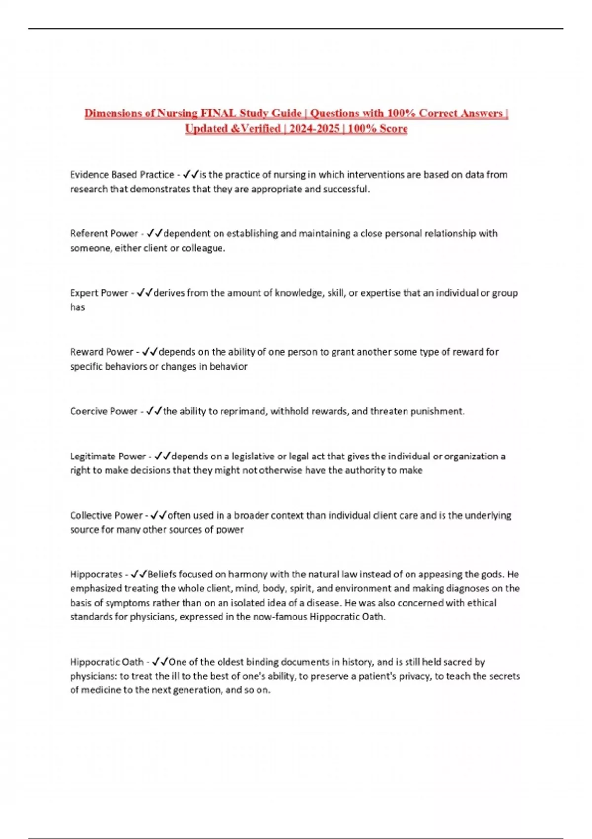 Dimensions of Nursing FINAL Study Guide | Questions with 100% Correct Answers | Updated &Verified | | 100% Score