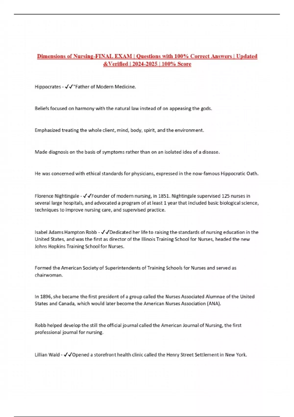 Dimensions of Nursing-FINAL EXAM | Questions with 100% Correct Answers | Updated &Verified | | 100% Score