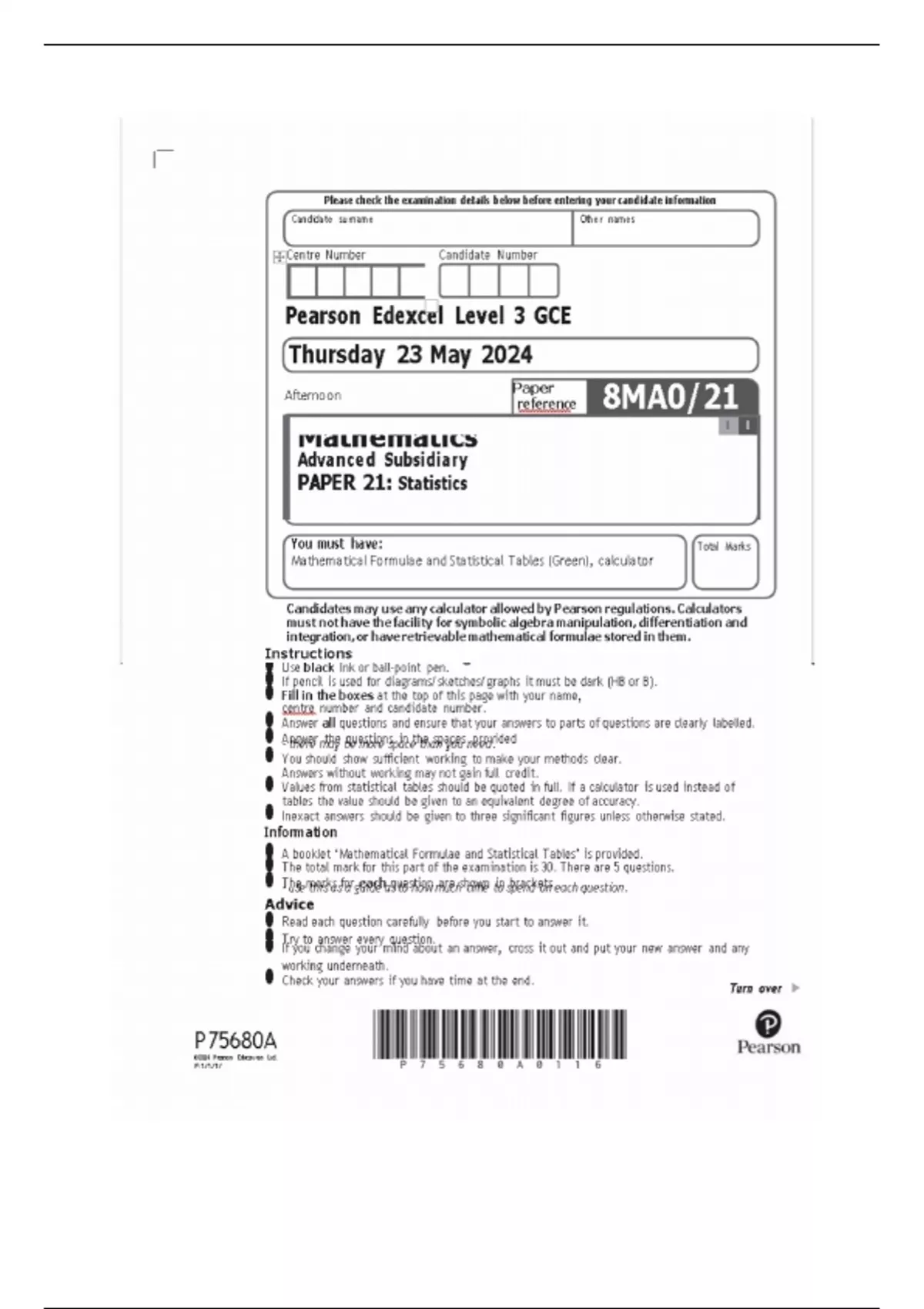 actual exam questions gce edexcel 2024 as level mathematics statistics paper 21 qp