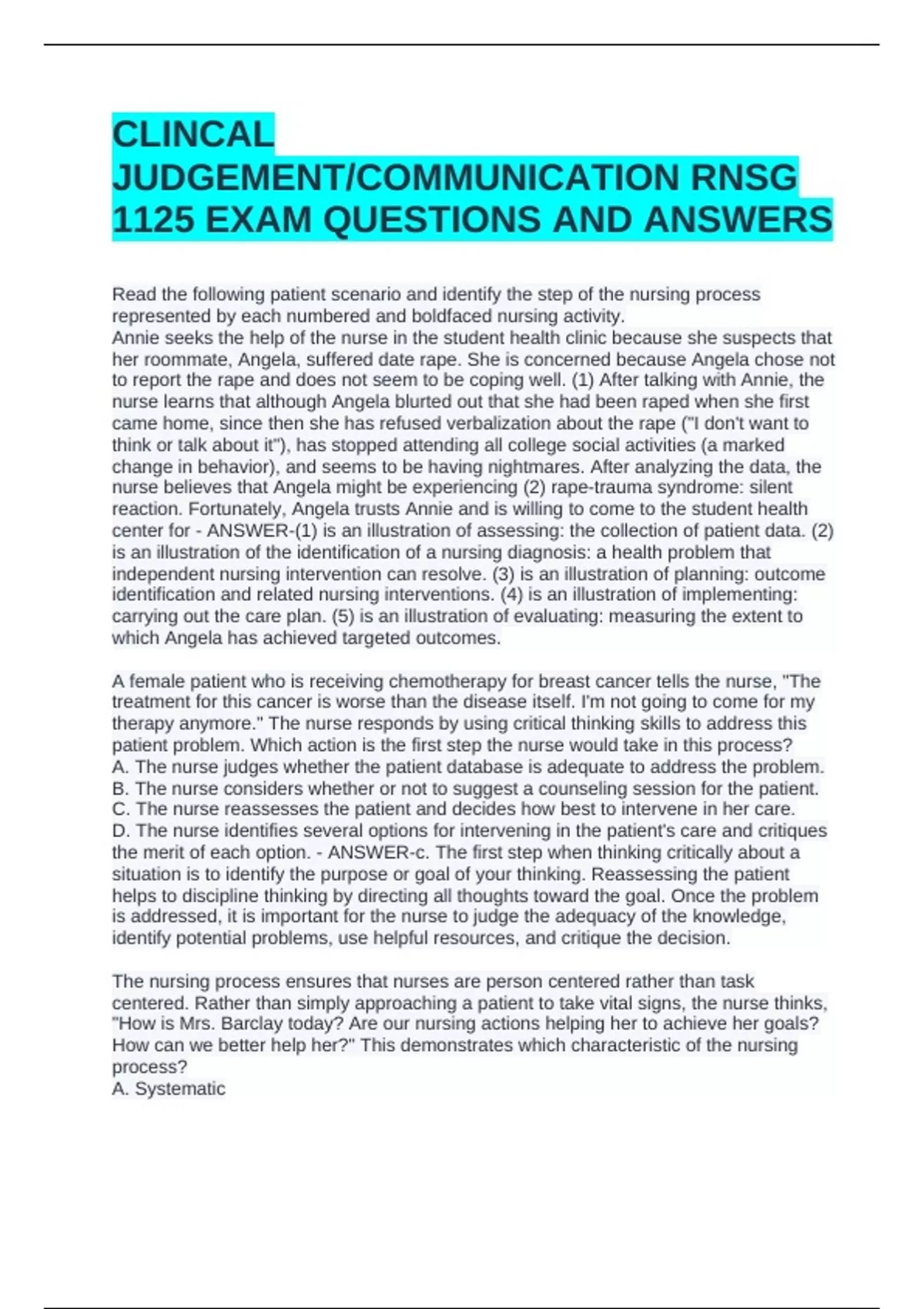 nurse believes that Angela might be experiencing (2) rape-trauma syndrome: silent