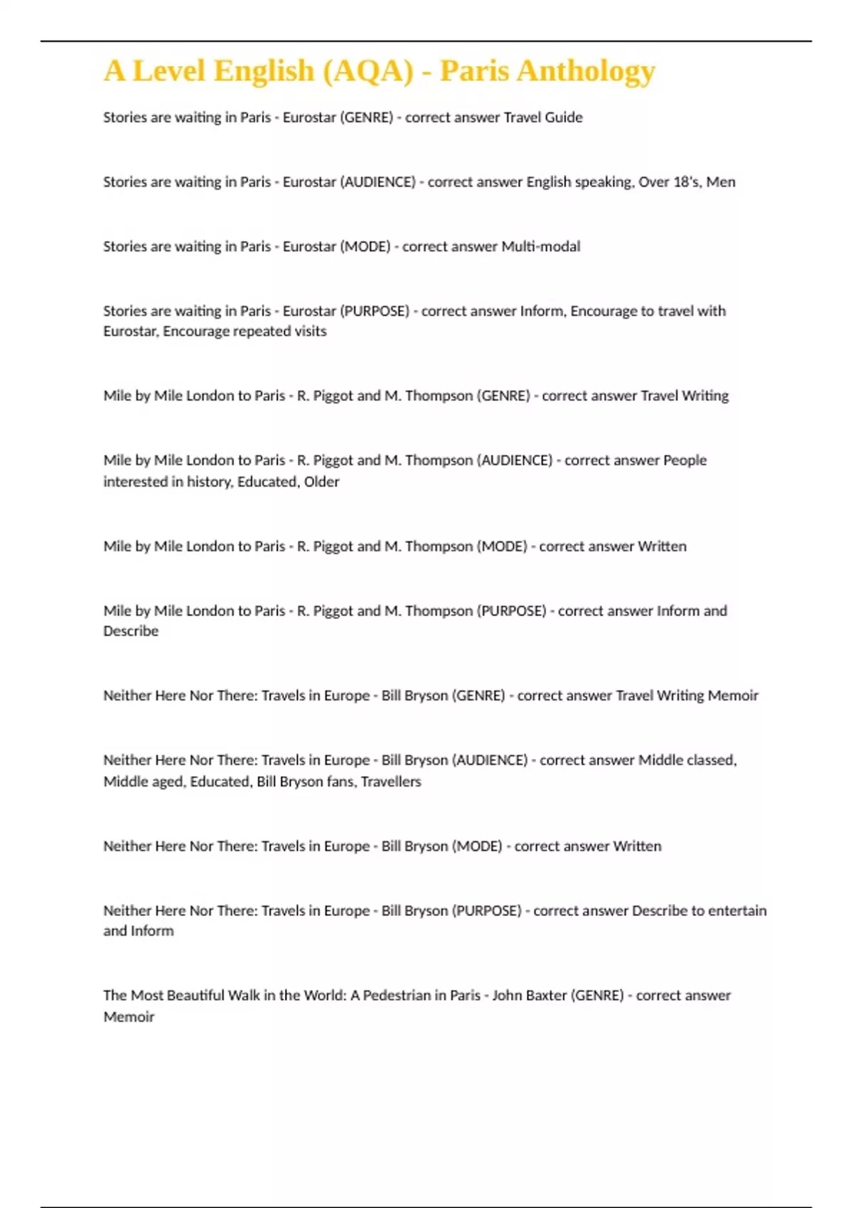 Mile by Mile London to Paris - R. Piggot and M. Thompson (GENRE) - correct answer Travel Writing