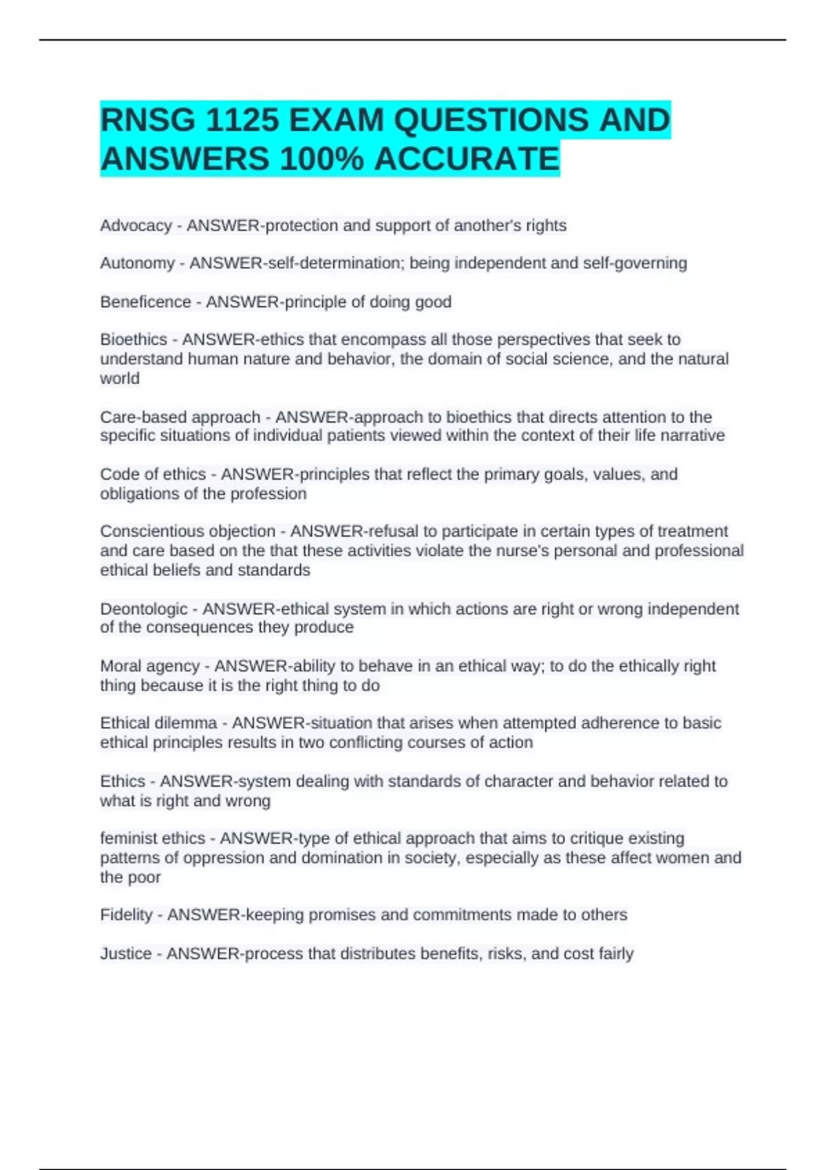 RNSG 1125 EXAM QUESTIONS AND ANSWERS 100% ACCURATERNSG 1125 EXAM QUESTIONS AND ANSWERS 100% ACCURATERNSG 1125 EXAM QUESTIONS AND ANSWERS 100% ACCURATE Advocacy - ANSWER-protection and support of another's rights Autonomy - ANSWER-self-determination; being independent and self-governing Beneficence - ANSWER-principle of doing good Bioethics - ANSWER-ethics that encompass all those perspectives that seek to understand human nature and behavior, the domain of social science, and the natural world Care-based approach - ANSWER-approach to bioethics that directs attention to the specific situations of individual patients viewed within the context of their life narrative