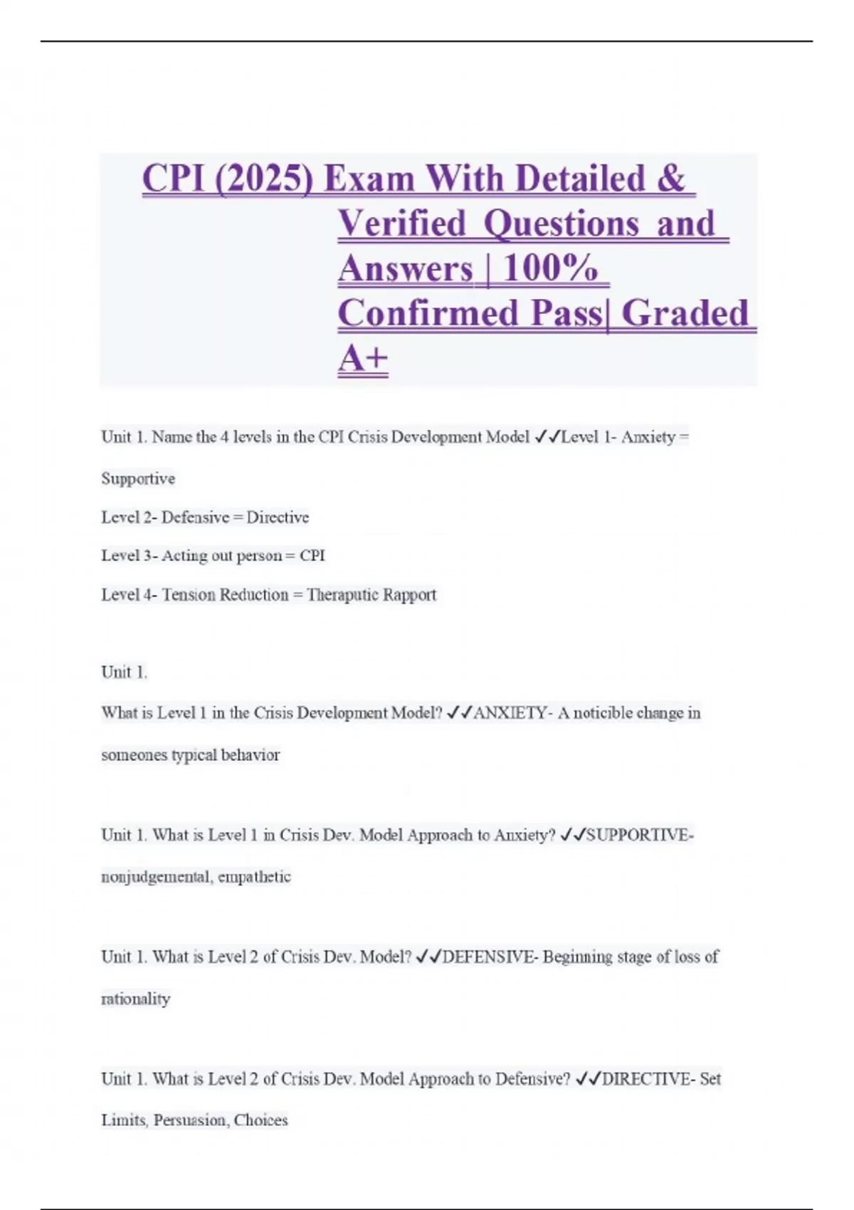 Unit 1. Name the 4 levels in the CPI Crisis Development Model Level 1- Anxiety = Supportive Level 2- Defensive = Directive Level 3- Acting out person = CPI Level 4- Tension Reduction = Theraputic Rapport Unit 1. What is Level 1 in the Crisis Development Model? ANXIETY- A noticible change in someones typical behavior Unit 1. What is Level 1 in Crisis Dev. Model Approach to Anxiety? SUPPORTIVEnonjudgemental, empathetic Unit 1. What is Level 2 of Crisis Dev. Model? DEFENSIVE- Beginning stage of loss of rationality Unit 1. What is Level 2 of Crisis Dev. Model Approach to Defensive? DIRECTIVE- Set Limits, Persuasion, Choices