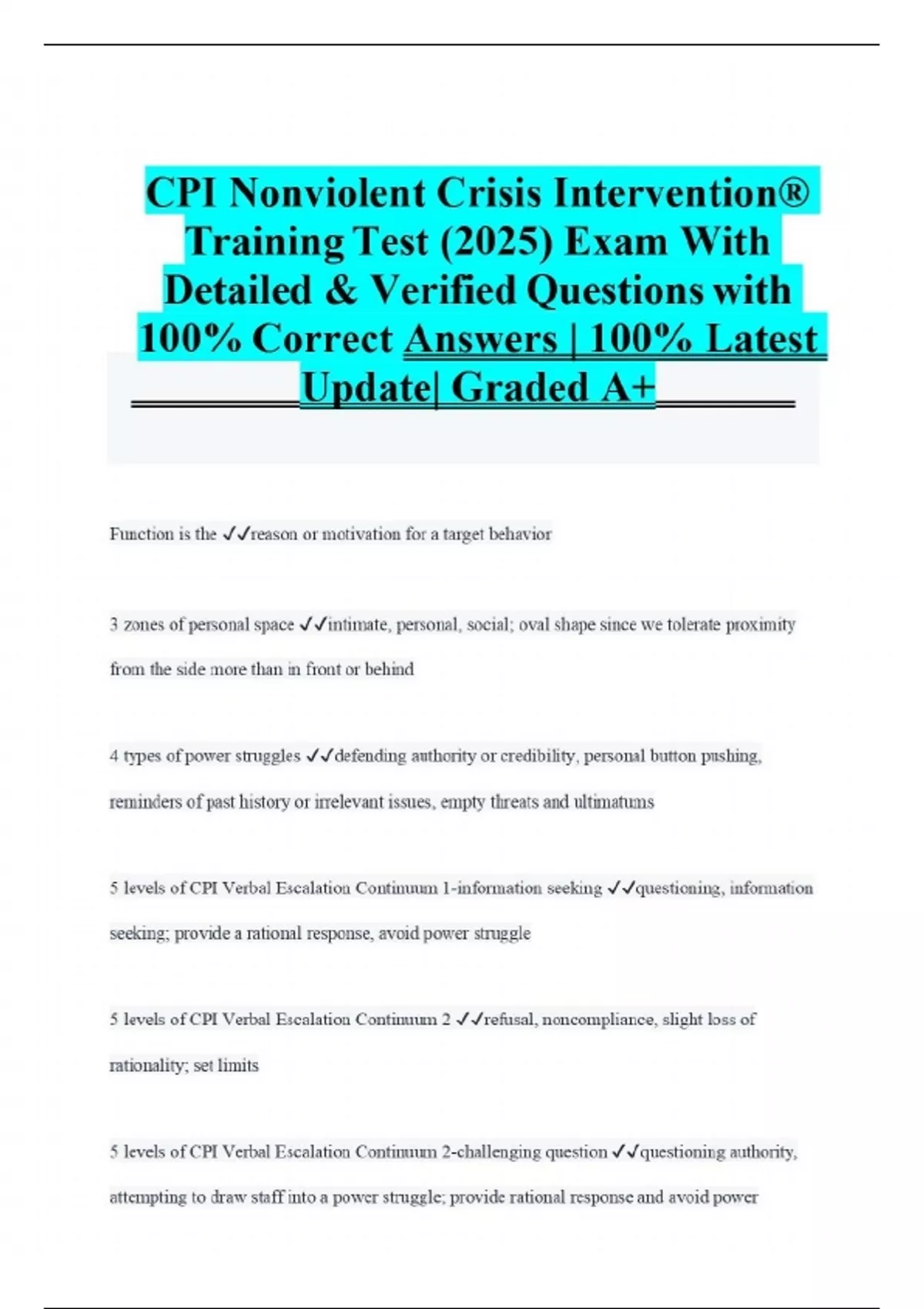 CPI Nonviolent Crisis Intervention® Training Test (2025) Exam With Detailed & Verified Questions with 100% Correct Answers | 100% Latest Update| Graded A+