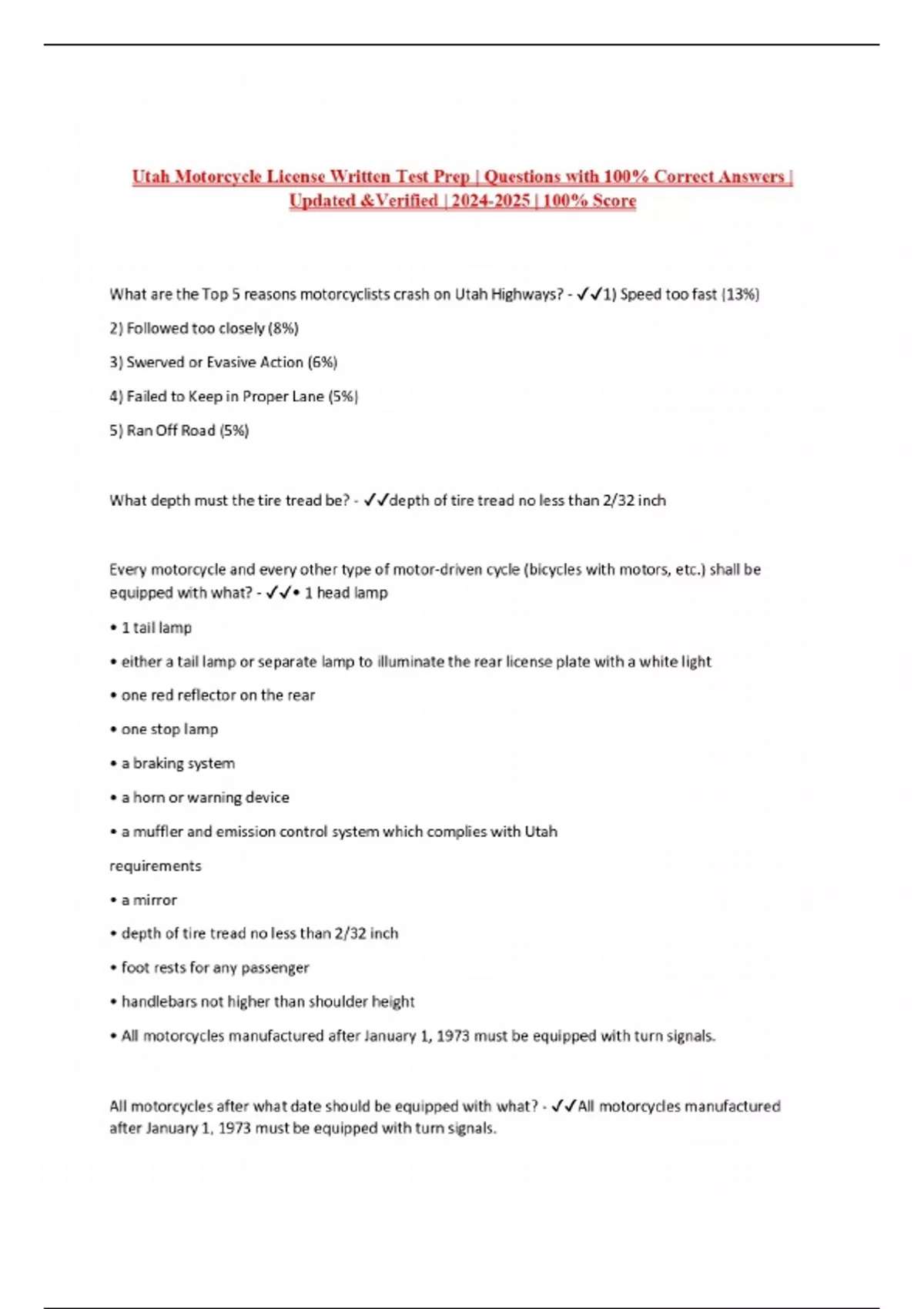 Utah Motorcycle License Written Test Prep | Questions with 100% Correct Answers | Updated &Verified | | 100% Score