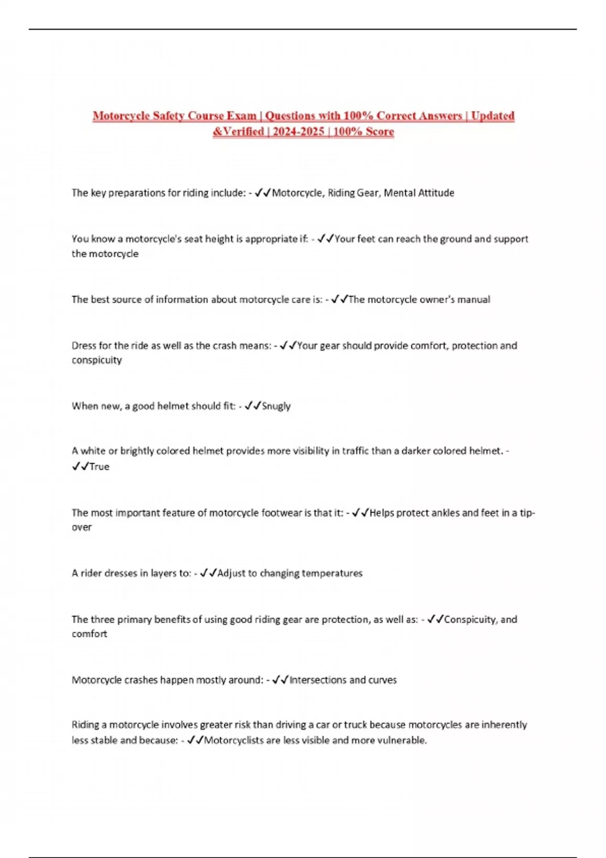 Motorcycle Safety Course Exam | Questions with 100% Correct Answers | Updated &Verified | | 100% Score