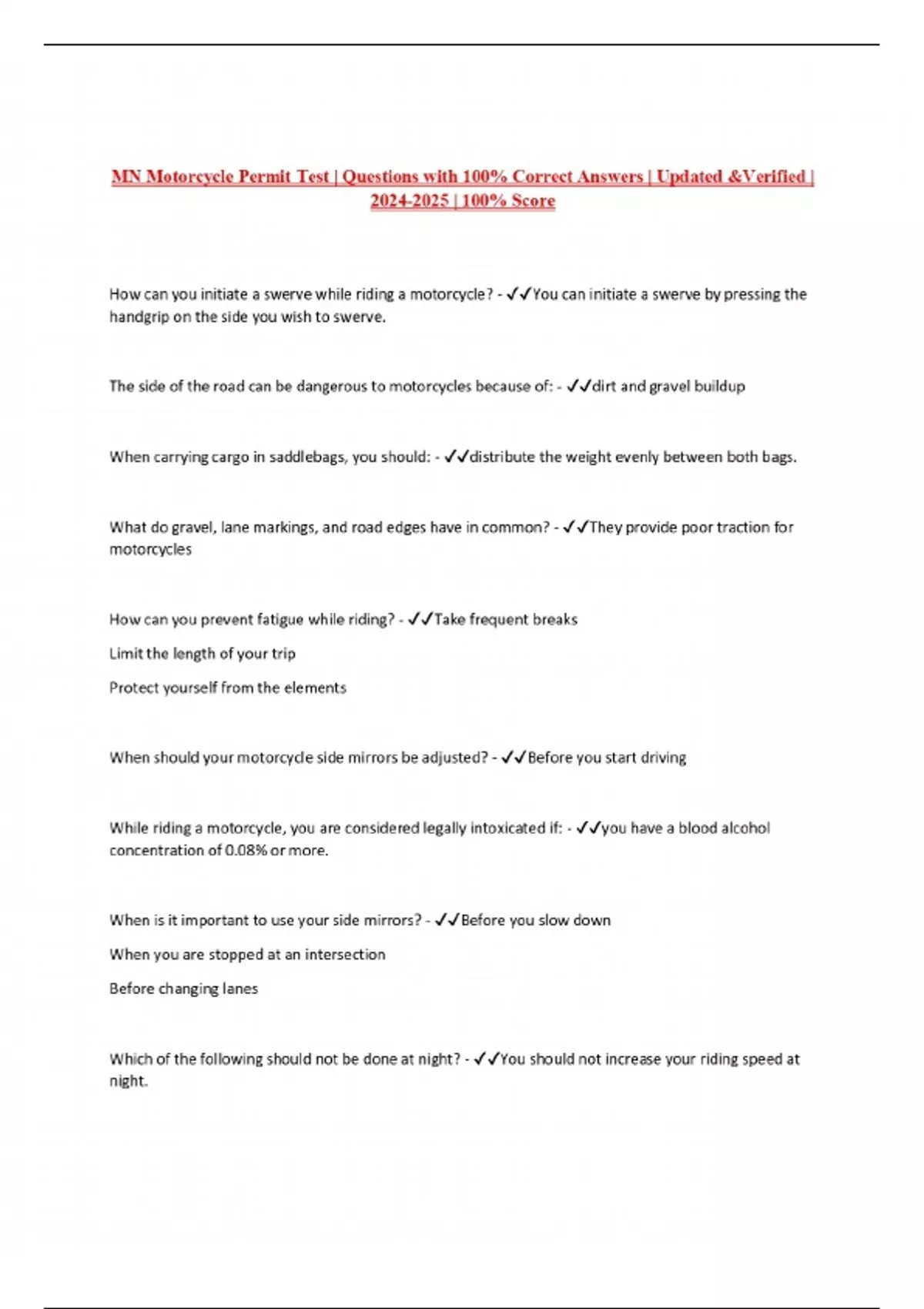 MN Motorcycle Permit Test | Questions with 100% Correct Answers | Updated &Verified | | 100% Score
