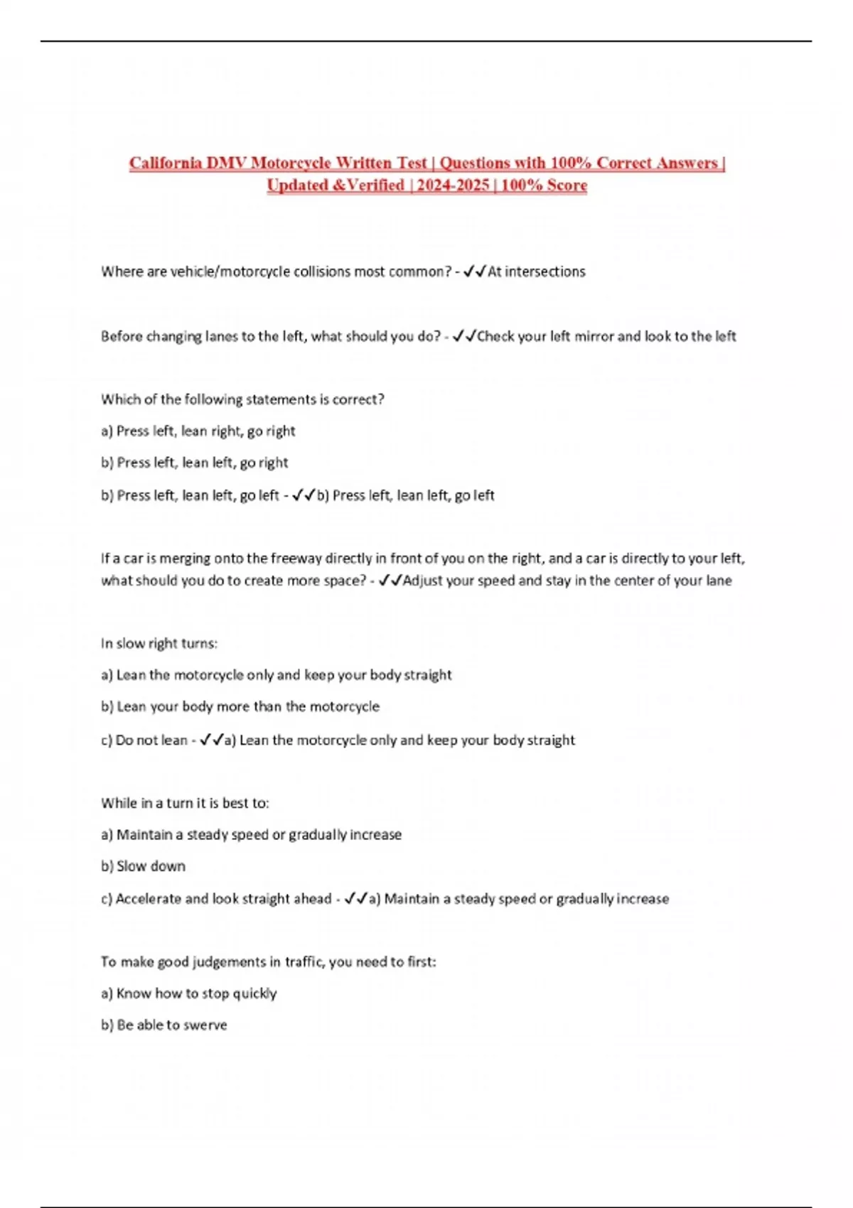 California DMV Motorcycle Written Test | Questions with 100% Correct Answers | Updated &Verified | | 100% Score