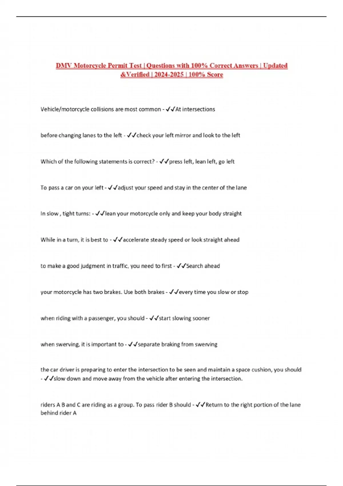 DMV Motorcycle Permit Test | Questions with 100% Correct Answers | Updated &Verified | | 100% Score