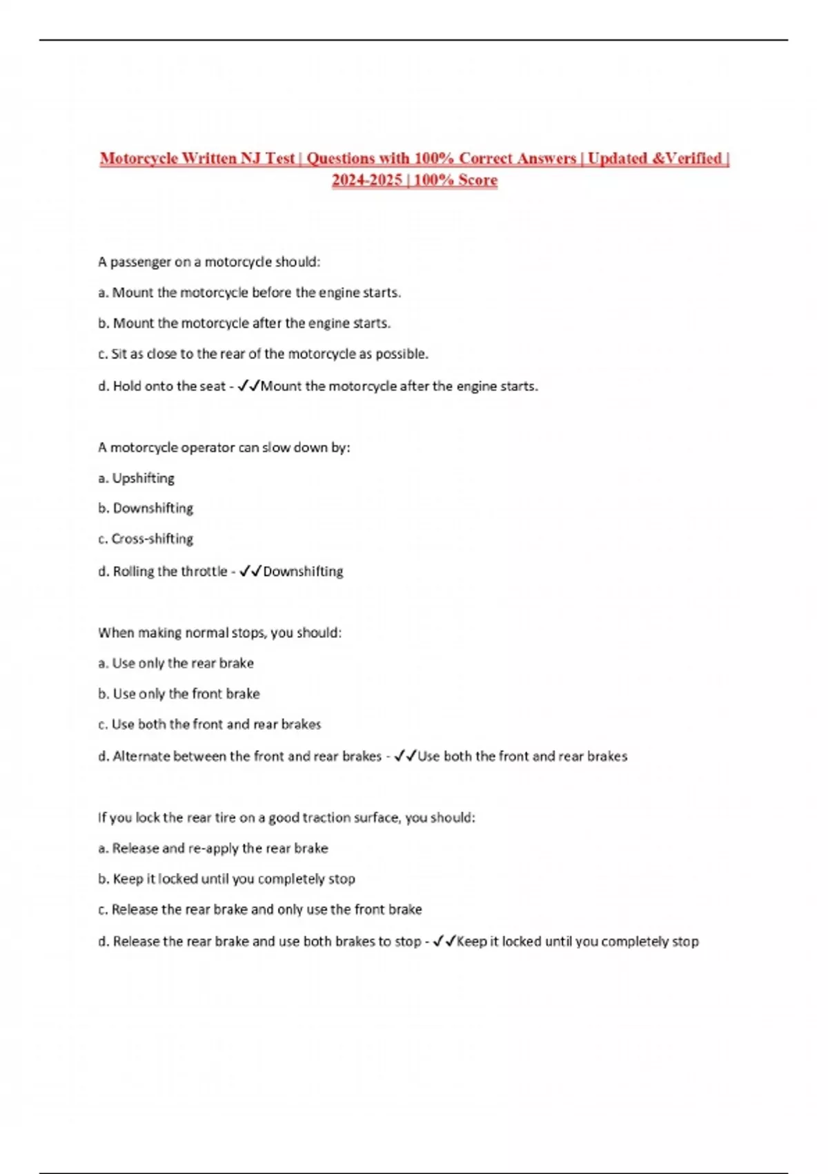 Motorcycle Written NJ Test | Questions with 100% Correct Answers | Updated &Verified | | 100% Score