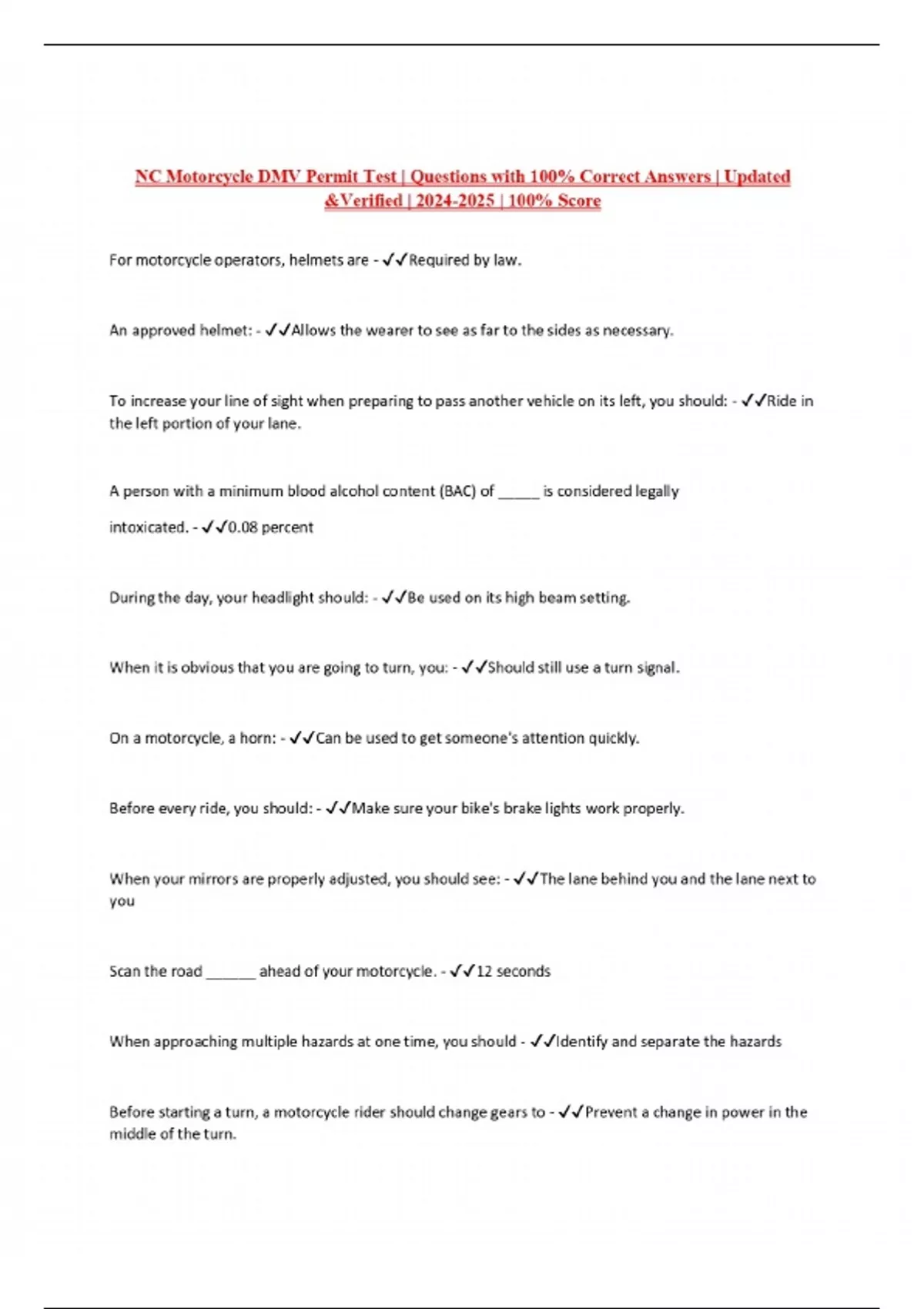 NC Motorcycle DMV Permit Test | Questions with 100% Correct Answers | Updated &Verified | | 100% Score