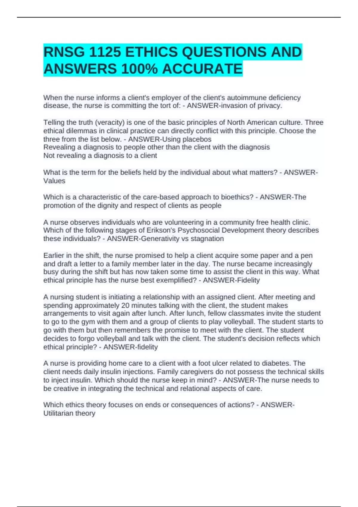 RNSG 1125 ETHICS QUESTIONS AND ANSWERS 100% ACCURATE