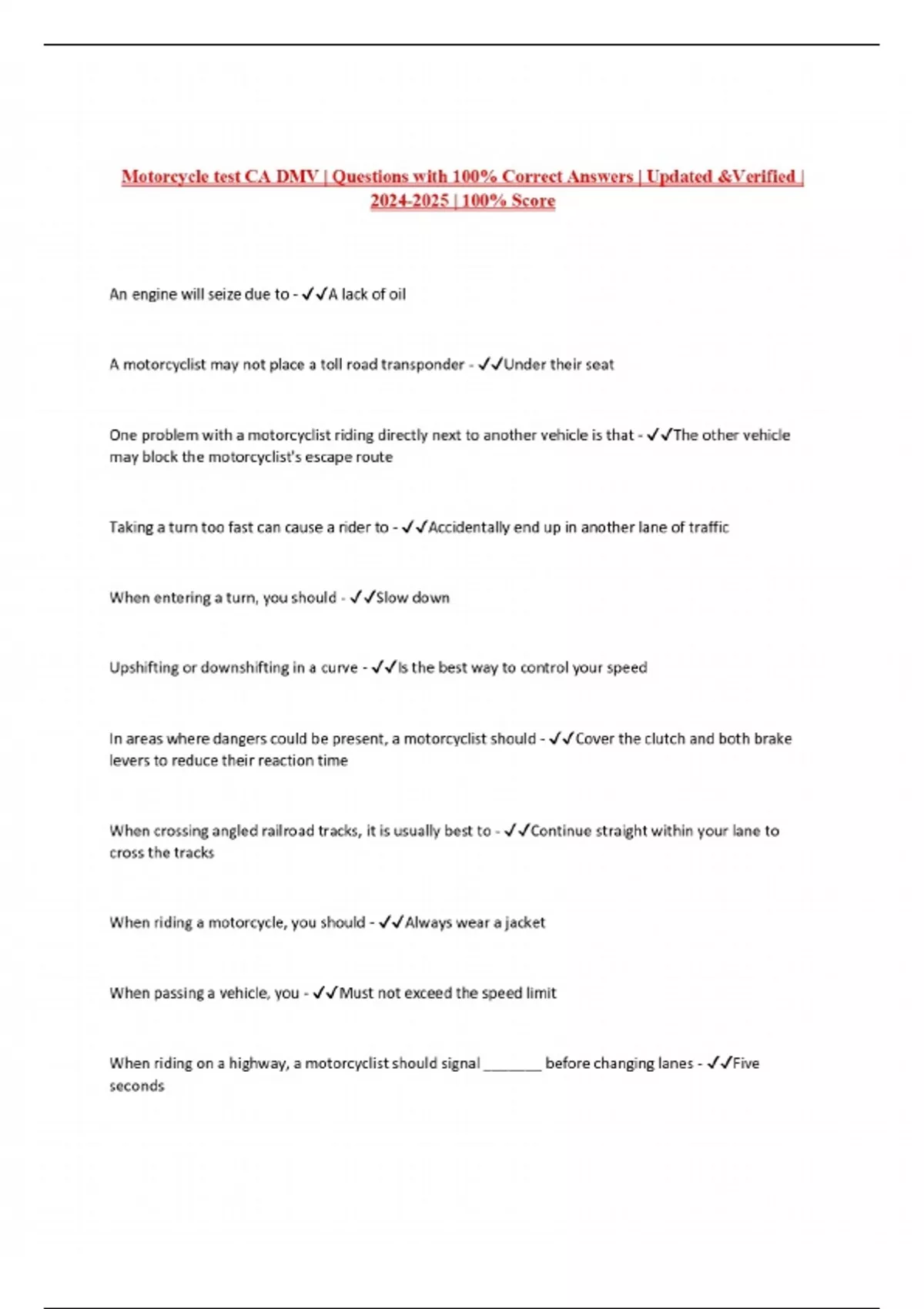 Motorcycle test CA DMV | Questions with 100% Correct Answers | Updated &Verified | | 100% Score