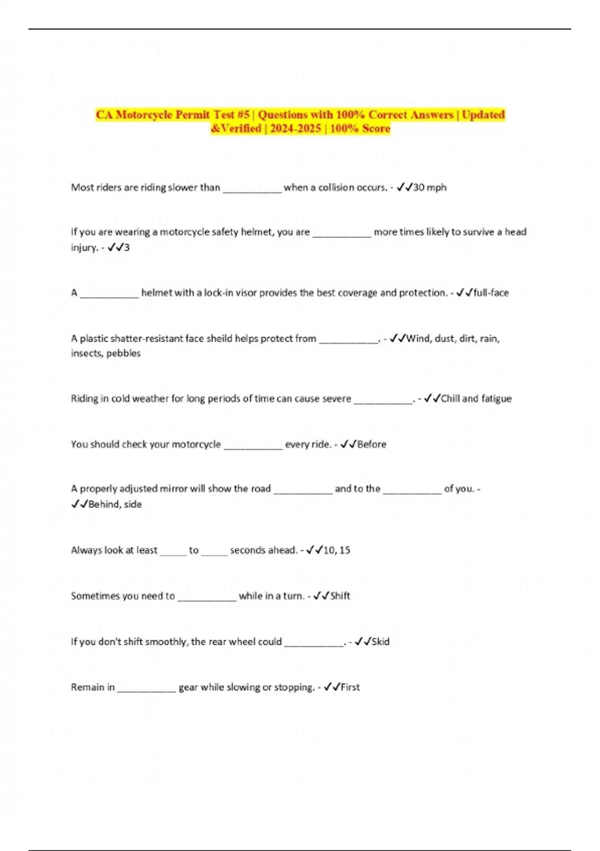 CA Motorcycle Permit Test #5 | Questions with 100% Correct Answers | Updated &Verified | | 100% Score
