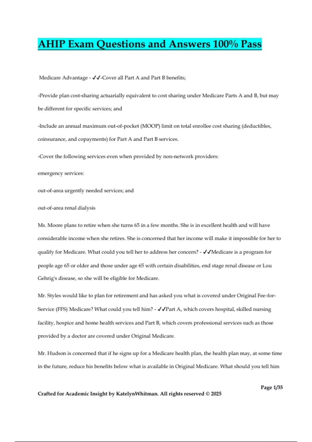 AHIP Exam Questions and Answers 100% Pass Medicare Advantage - -Cover all Part A and Part B benefits; -Provide plan cost-sharing actuarially equivalent to cost sharing under Medicare Parts A and B, but may be different for specific services; and -Include an annual maximum out-of-pocket (MOOP) limit on total enrollee cost sharing (deductibles, coinsurance, and copayments) for Part A and Part B services. -Cover the following services even when provided by non-network providers: emergency services: out-of-area urgently needed services; and out-of-area renal dialysis Ms. Moore plans to retire when she turns 65 in a few months. She is in excellent health and will have considerable income when she retires. She is concerned that her income will make it impossible for her to qualify for Medicare. What could you tell her to address her concern? - Medicare is a program for people age 65 or older and those under age 65 with certain disabilities, end stage renal disease or Lou Gehrig's disease, so she will be eligible for Medicare. Mr. Styles would like to plan for retirement and has asked you what is covered under Original Fee-for- Service (FFS) Medicare? What could you tell him? - Part A, which covers hospital, skilled nursing facility, hospice and home health services and Part B, which covers professional services such as those provided by a doctor are covered under Original Medicare. Mr. Hudson is concerned that if he signs up for a Medicare health plan, the health plan may, at some time in the future, reduce his benefits below what is available in Original Medicare. What should you tell him Page 2/35 Crafted for Academic Insight by KatelynWhitman. All rights reserved © 2025 about his concern? - Medicare health plans must cover all benefits available under Medicare Part A and Part B. Many also cover Part D prescription drugs. Mrs. Geisler's neighbor told her she should look at her Part D options during the annual Medicare enrollment period because features of Part D might have changed. Mrs. Geisler can't remember what Part D is so she called you to ask what her neighbor was talking about. What could you tell her? - Part D covers prescription drugs and she should look at her premiums, formulary, and cost sharing to see if they have changed. Mrs. Weems wants to know generally how the benefits under Original Medicare might compare to the benefit package of a Medicare Health Plan before she starts looking at specific plans. What could you tell her? - Medicare Health Plans may offer extra benefits that Original Medicare does not offer such as vision, hearing, and dental services and must include a maximum out-of-pocket limit on Part A and Part B services. Mr. Meoni's wife has a Medicare Advantage plan, but he wants to understand what coverage Medicare Supplemental Insurance provides since his health care needs are different from his wife's needs. What could you tell Mr.Meoni? - Medicare Supplemental Insurance would help cover his Part A and Part B cost sharing in Original Fee-for-Service (FFS) Medicare as well as possibly some services that Medicare does not cover. Mr. Meoni's wife has a Medicare Advantage plan, but he wants to understand what coverage Medicare Supplemental Insurance provides since his health care needs are different from his wife's needs. What could you tell Mr.Meoni? - Most individuals who are citizens and over age 65 are covered under Part A by virtue of having paid Medicare taxes while working, though some may be covered as a result of paying monthly premiums. Mr. Bauer is 49 years old, but eighteen months ago he was declared disabled by the Social Security Administration and has been receiving disability payments. He is wondering whether he can obtain Page 3/35 Crafted for Academic Insight by KatelynWhitman. All rights reserved © 2025 coverage under Medicare. What should you tell him? - After receiving such disability payments for 24 months, he will be automatically enrolled in Medicare, regardless of age. Mr. Davis is 49 years old and has been receiving disability benefits from the Social Security Administration for 12 months. Can you sell him a Medicare Advantage or Part D Prescription Drug policy? - No, he cannot purchase a Medicare Advantage or Part D policy because he has not received Social Security or Railroad Retirement disability benefits for 24 months. Ms. Henderson believes that she will qualify for Medicare coverage when she turns 65, without paying any premiums, because she has been working for 40 years and paying Medicare taxes. What should you tell her? - In order to obtain Part B coverage, she must pay a standard monthly premium, though it is higher for individuals with higher incomes. Mr. Diaz continued working with his company and was insured under his employer's group plan until he reached age 68. He has heard that there is a premium penalty for those who did not sign up for Part B when first eligible and wants to know how much he will have to pay. What should you tell him? - Mr. Diaz will not pay any penalty because he had continuous coverage under his employer's plan. Mrs. Peňa is 66 years old, has coverage under an employer plan and will retire next year. She heard she must enroll in Part B at the beginning of the year to ensure no gap in coverage. What can you tell her? - She may enroll at any time while she is covered under her employer plan, but she will have a special eight-month enrollment period that differs from the standard general enrollment period, during which she may enroll in Medicare Part B. Mrs. Kelly is entitled to Part A, but is not yet enrolled in Part B. She is considering enrollment in a Medicare health plan. What should you advise her to do before she will be able to enroll into a Medicare health plan? - In order to join a Medicare health plan, she must be enrolled in Parts A, B and D Page 4/35 Crafted for Academic Insight by KatelynWhitman. All rights reserved © 2025 Mrs. Toma has a low, fixed income. What could you tell her that m