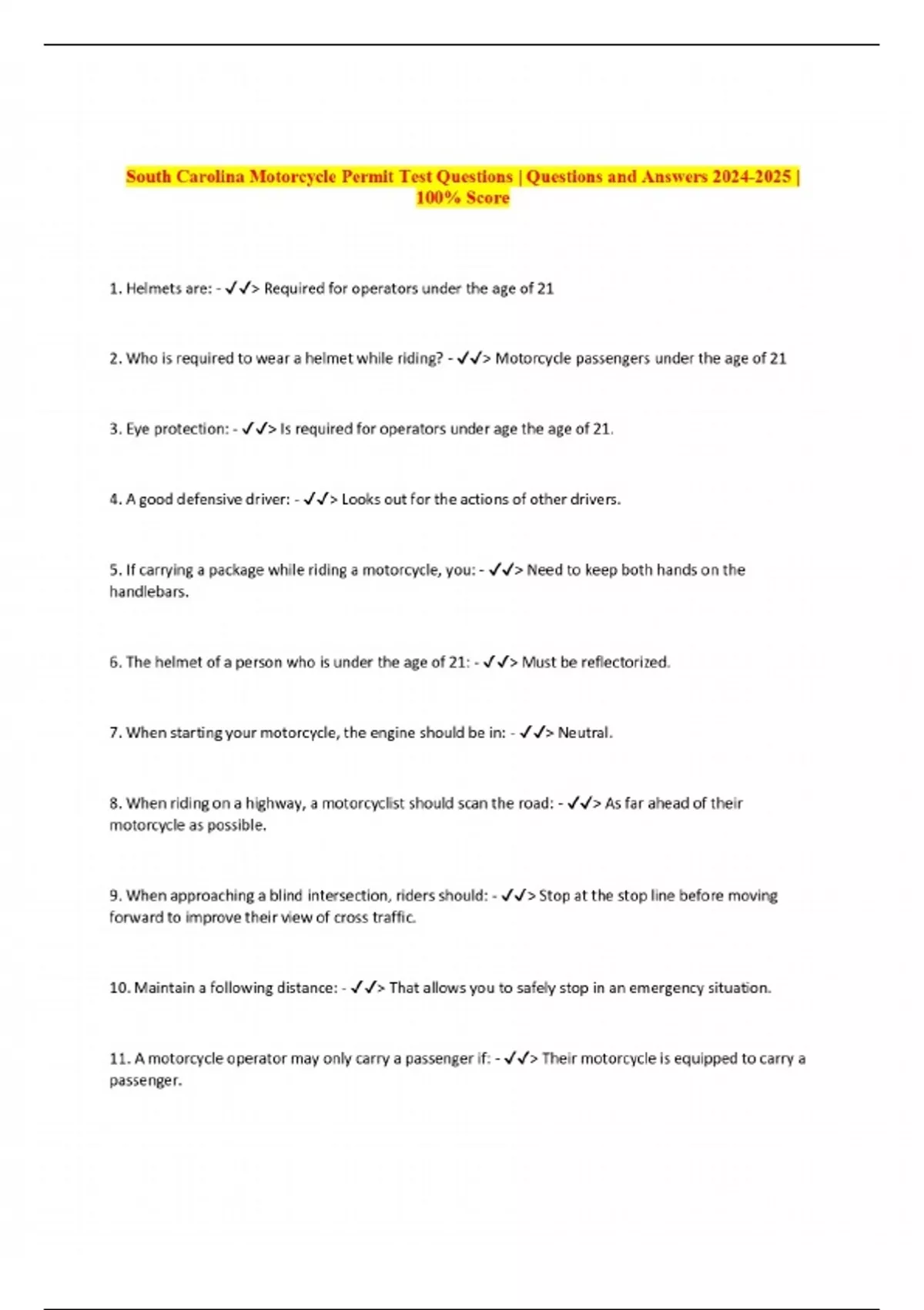 South Carolina Motorcycle Permit Test Questions | Questions and Answers | 100% Score