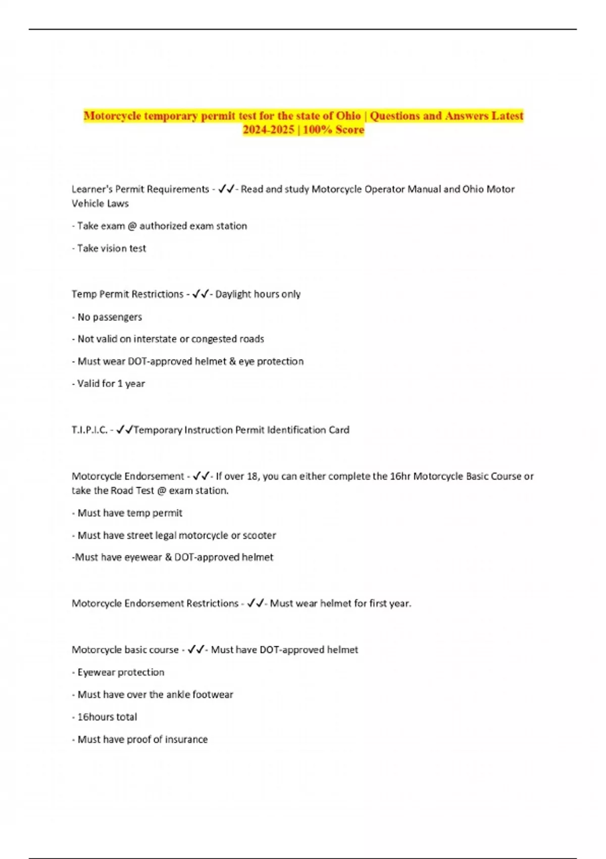 Motorcycle temporary permit test for the state of Ohio | Questions and Answers Latest | 100% Score