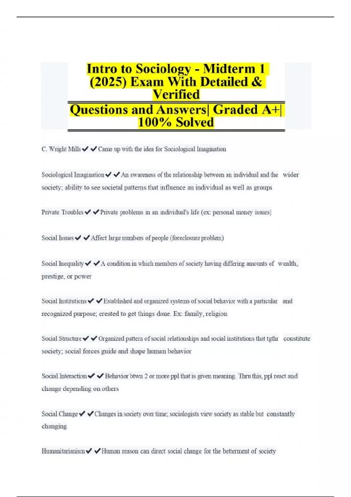 Intro to Sociology - Midterm 1 (2025) Exam With Detailed & Verified Questions and Answers| Graded A+| 100% Solved