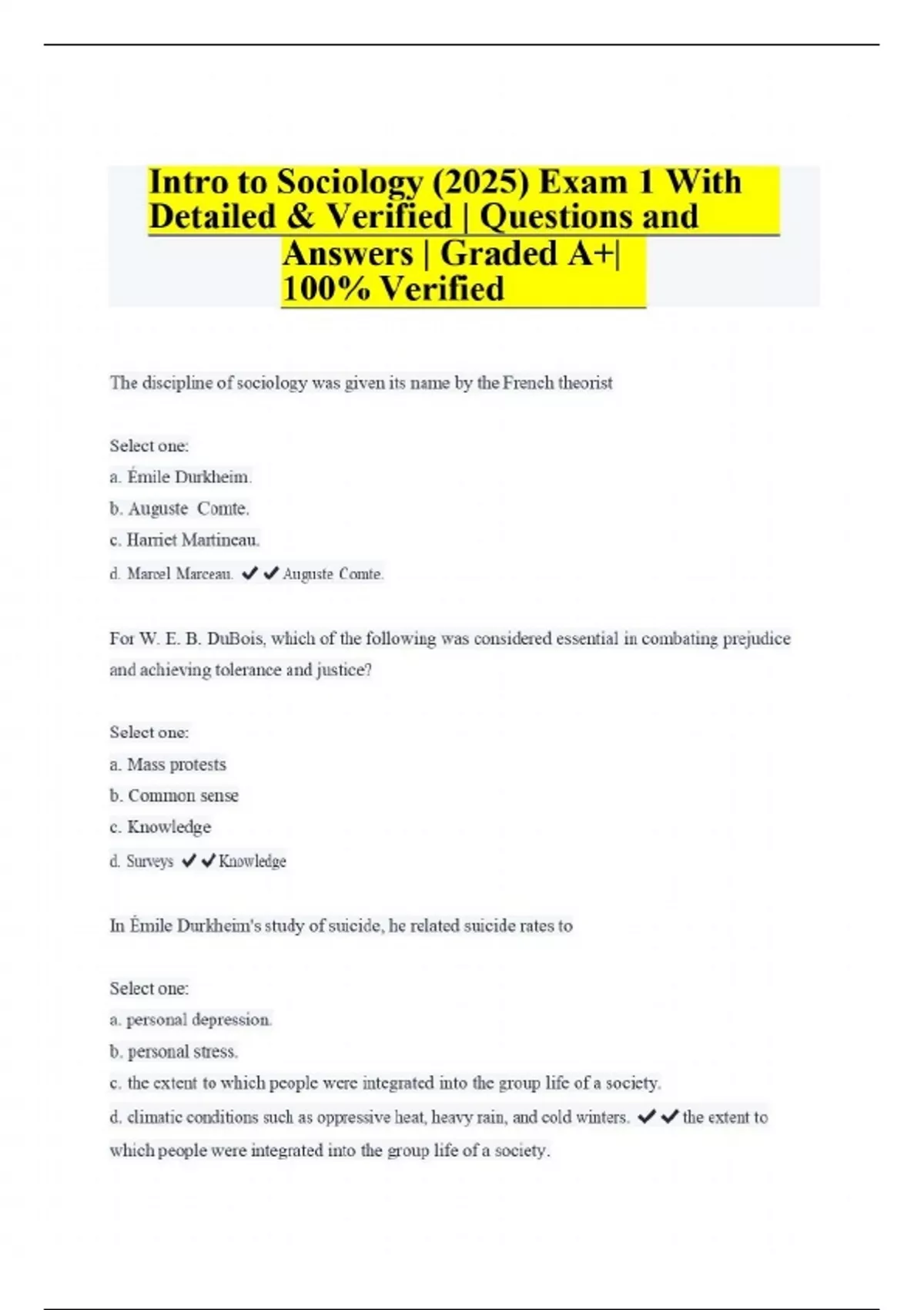 The discipline of sociology was given its name by the French theorist Select one: a. Émile Durkheim. b. Auguste Comte. c. Harriet Martineau. d. Marcel Marceau. ️️Auguste Comte. For W. E. B. DuBois, which of the following was considered essential in combating prejudice and achieving tolerance and justice? Select one: a. Mass protests b. Common sense c. Knowledge d. Surveys ️️Knowledge In Émile Durkheim's study of suicide, he related suicide rates to Select one: a. personal depression. b. personal stress. c. the extent to which people were integrated into the group life of a society. d. climatic conditions such as oppressive heat, heavy rain, and cold winters. ️️the extent to which people were integrated into the group life of a society.