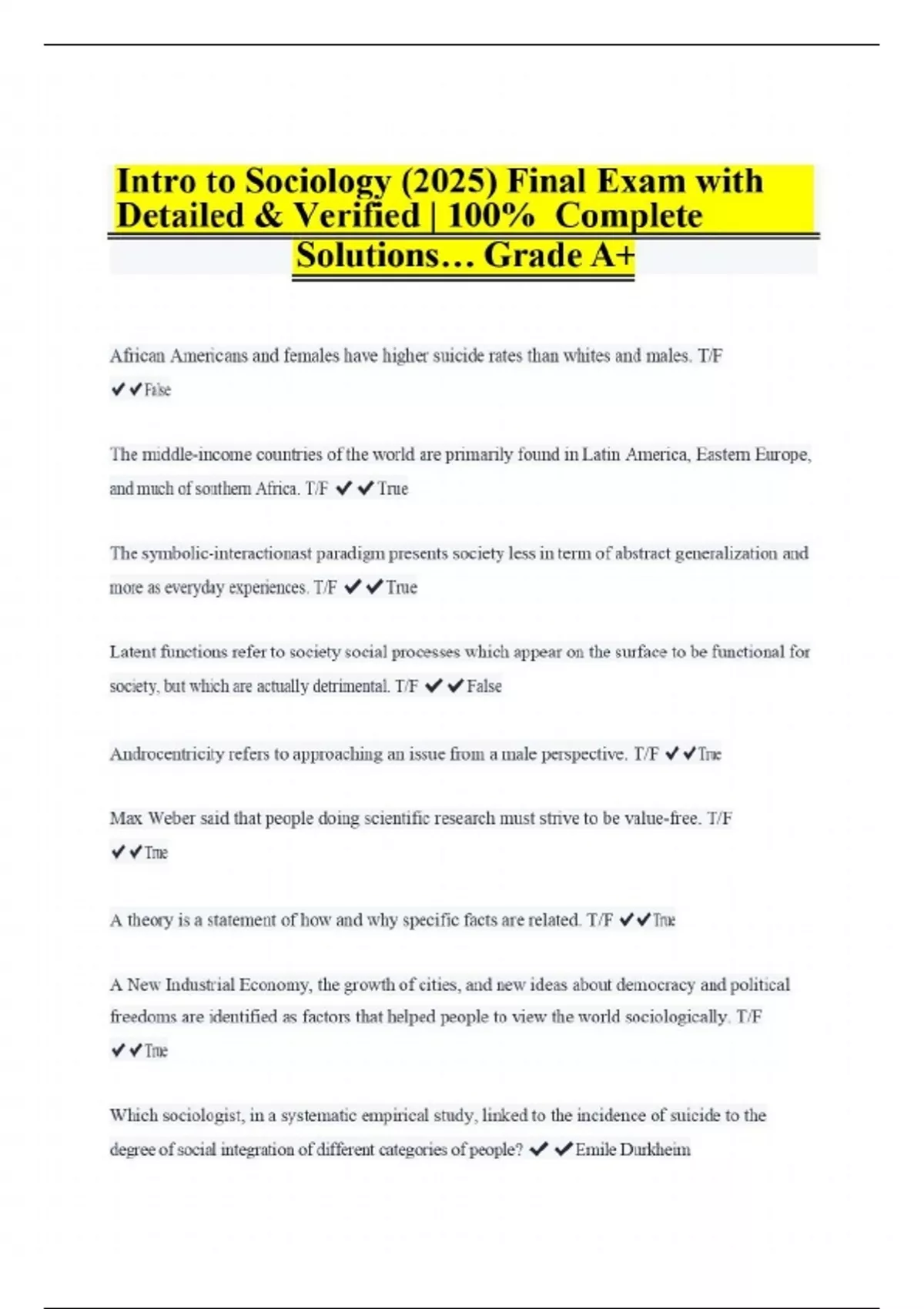 African Americans and females have higher suicide rates than whites and males. T/F ️️False The middle-income countries of the world are primarily found in Latin America, Eastern Europe, and much of southern Africa. T/F ️️True The symbolic-interactionast paradigm presents society less in term of abstract generalization and more as everyday experiences. T/F ️️True Latent functions refer to society social processes which appear on the surface to be functional for society, but which are actually detrimental. T/F ️️False Androcentricity refers to approaching an issue from a male perspective. T/F ️️True Max Weber said that people doing scientific research must strive to be value-free. T/F ️️True A theory is a statement of how and why specific facts are related. T/F ️️True A New Industrial Economy, the growth of cities, and new ideas about democracy and political freedoms are identified as factors that helped people to view the world sociologically. T/F ️️True Which sociologist, in a systematic empirical study, linked to the incidence of suicide to the degree of social integration of different categories of people?️️Emile Durkheim
