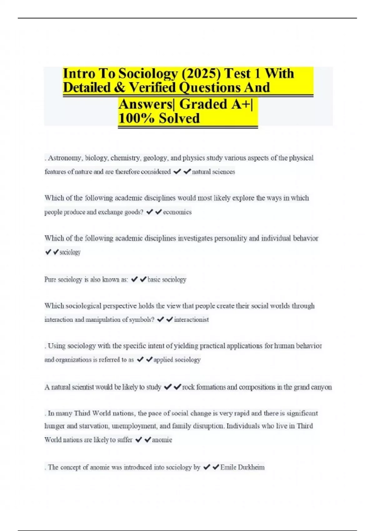 Intro To Sociology (2025) Test 1 With Detailed & Verified Questions And Answers| Graded A+| 100% Solved