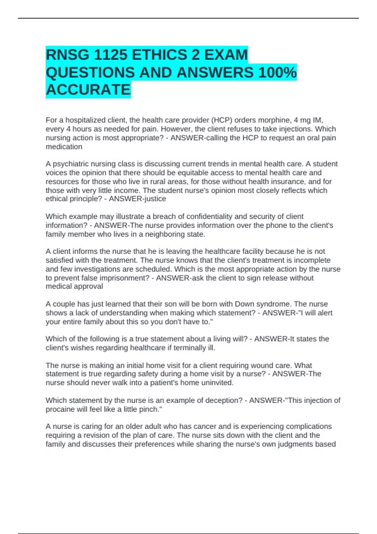 RNSG 1125 ETHICS 2 EXAM QUESTIONS AND ANSWERS 100% ACCURATERNSG 1125 ETHICS 2 EXAM QUESTIONS AND ANSWERS 100% ACCURATERNSG 1125 ETHICS 2 EXAM QUESTIONS AND ANSWERS 100% ACCURATE For a hospitalized client, the health care provider (HCP) orders morphine, 4 mg IM, every 4 hours as needed for pain. However, the client refuses to take injections. Which nursing action is most appropriate? - ANSWER-calling the HCP to request an oral pain medication A psychiatric nursing class is discussing current trends in mental health care. A student voices the opinion that there should be equitable access to mental health care and resources for those who live in rural areas, for those without health insurance, and for those with very little income. The student nurse's opinion most closely reflects which ethical principle? - ANSWER-justice Which example may illustrate a breach of confidentiality and security of client information? - ANSWER-The nurse provides information over the phone to the client's family member who lives in a neighboring state. A client informs the nurse that he is leaving the healthcare facility because he is not satisfied with the treatment. The nurse knows that the client's treatment is incomplete and few investigations are scheduled. Which is the most appropriate action by the nurse