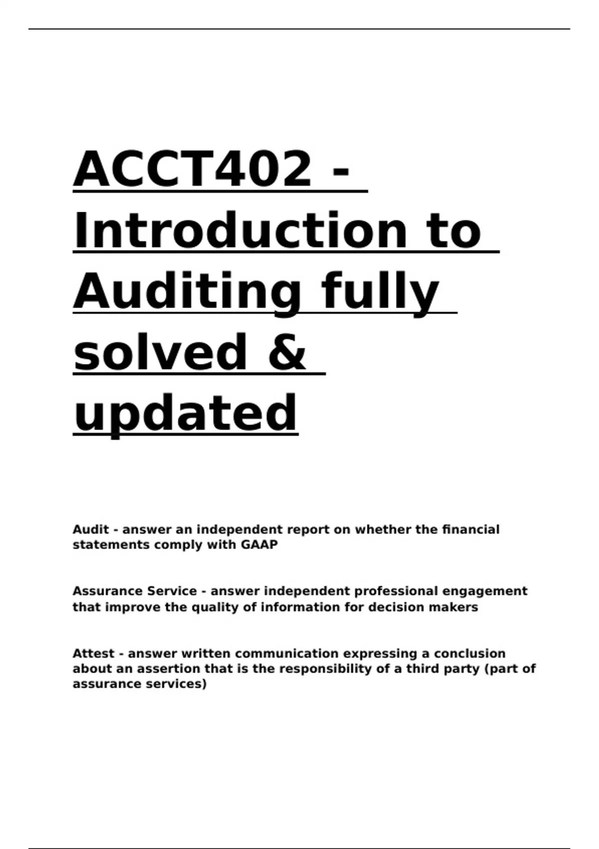 ACCT402 - Introduction to Auditing fully solved & updated.