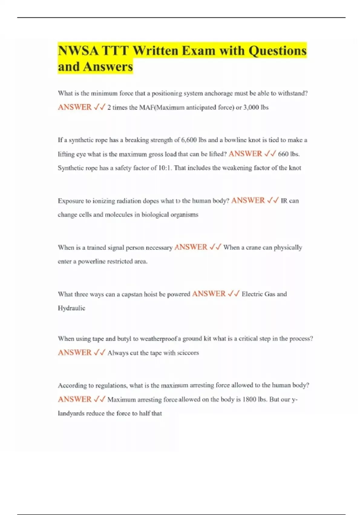 NWSA TTT Written Exam with Questions and Answers What is the minimum force that a positioning system anchorage must be able to withstand? ANSWER 2 times the MAF(Maximum anticipated force) or 3,000 lbs If a synthetic rope has a breaking strength of 6,600 lbs and a bowline knot is tied to make a lifting eye what is the maximum gross load that can be lifted? ANSWER 660 lbs. Synthetic rope has a safety factor of 10:1. That includes the weakening factor of the knot Exposure to ionizing radiation dopes what to the human body? ANSWER IR can change cells and molecules in biological organisms When is a trained signal person necessary ANSWER When a crane can physically enter a powerline restricted area. What three ways can a capstan hoist be powered ANSWER Electric Gas and Hydraulic When using tape and butyl to weatherproof a ground kit what is a critical step in the process? ANSWER Always cut the tape with sciccors According to regulations, what is the maximum arresting force allowed to the human body? ANSWER Maximum arresting force allowed on the body is 1800 lbs. But our y-landyards reduce the force to half that What is the minimum number of ground kits installed in a single run ANSWER 3. (1