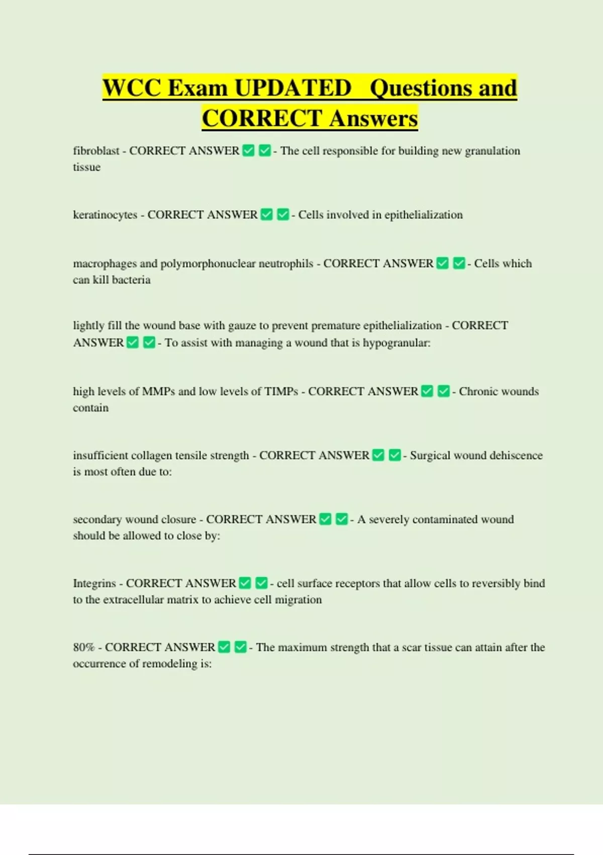 WCC Exam UPDATED Questions and CORRECT Answers fibroblast - CORRECT ANSWER - The cell responsible for building new granulation tissue keratinocytes - CORRECT ANSWER - Cells involved in epithelialization macrophages and polymorphonuclear neutrophils - CORRECT ANSWER - Cells which can kill bacteri