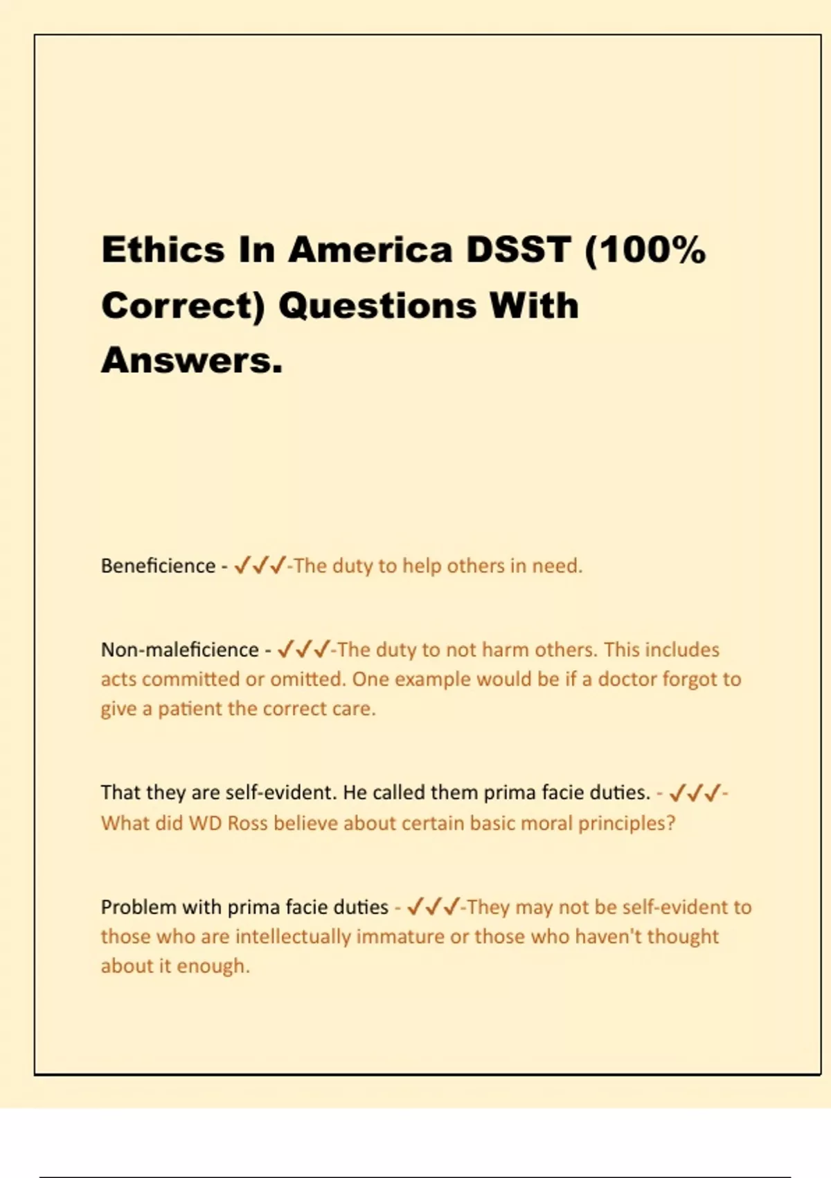 Ethics In America DSST (100% Correct) Questions With Answers. Beneficience - -The duty to help others in need. Non-maleficience - -The duty to not harm others. This includes acts committed or omitted. One example would be if a doctor forgot to give a patient the correct care.