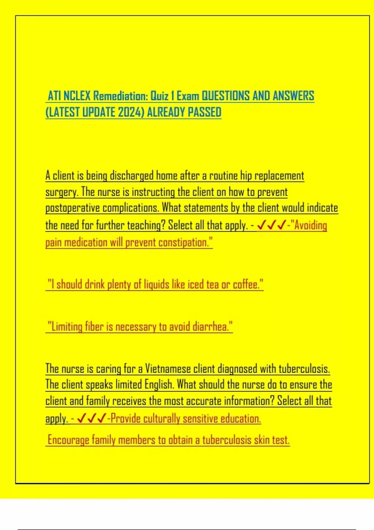 ATI NCLEX Remediation: Quiz 1 Exam QUESTIONS AND ANSWERS (LATEST UPDATE 2024) ALREADY PASSED A client is being discharged home after a routine hip replacement surgery. The nurse is instructing the client on how to prevent postoperative complications. What statements by the client would indicate the need for further teaching? Select all that apply. - -"Avoiding pain medication will prevent constipation."