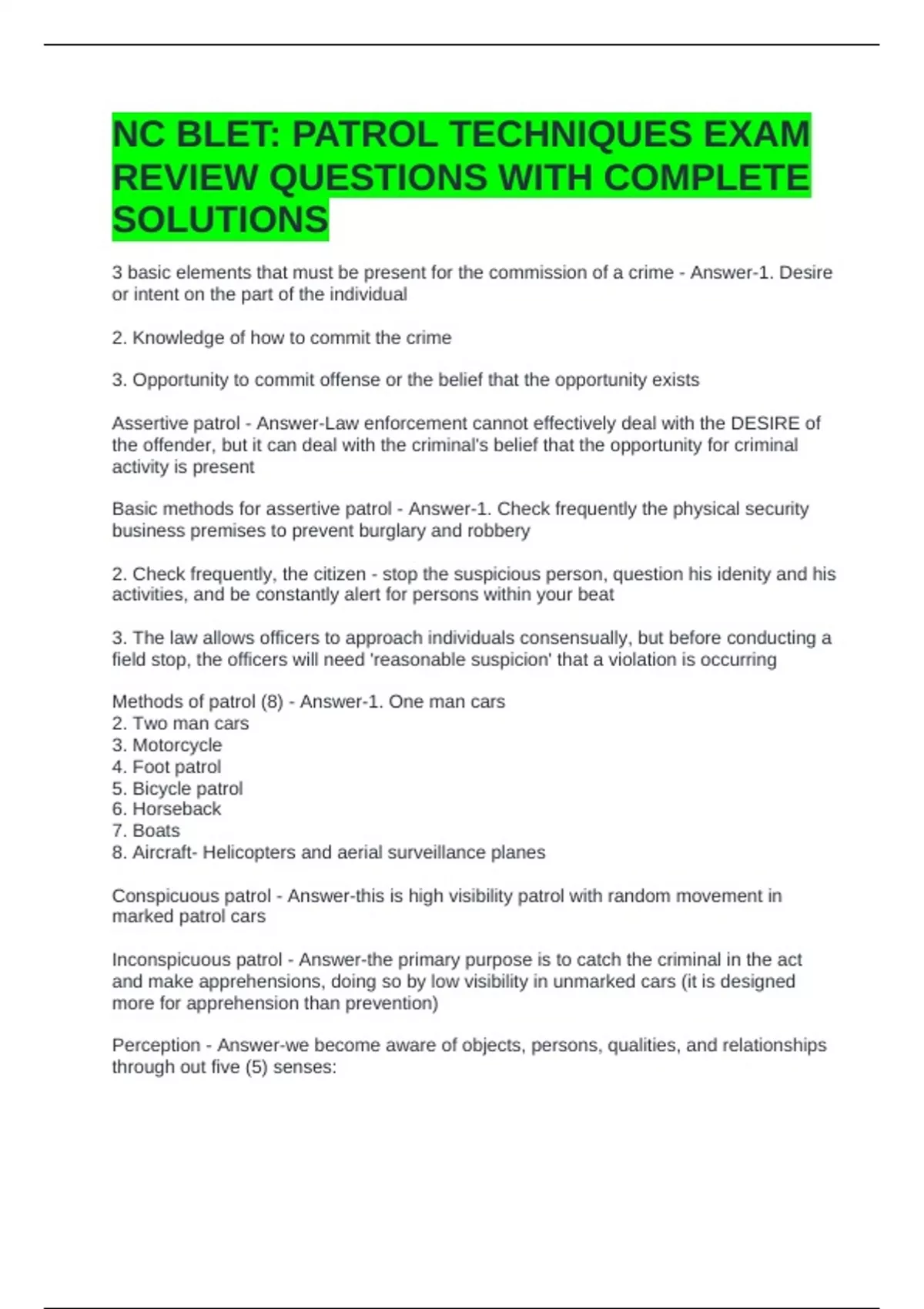 NC BLET: PATROL TECHNIQUES EXAM REVIEW QUESTIONS WITH COMPLETE SOLUTIONS