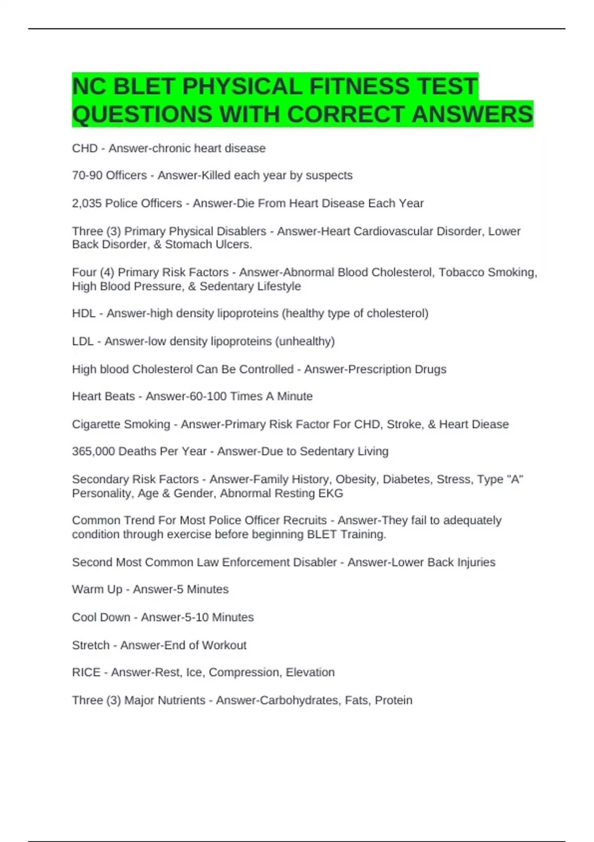 NC BLET PHYSICAL FITNESS TEST QUESTIONS WITH CORRECT ANSWERS