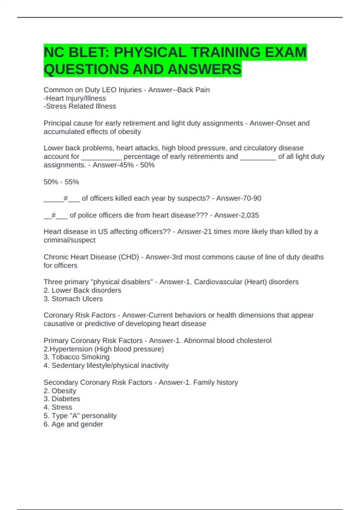Chronic Heart Disease (CHD) - Answer-3rd most commons cause of line of duty deaths