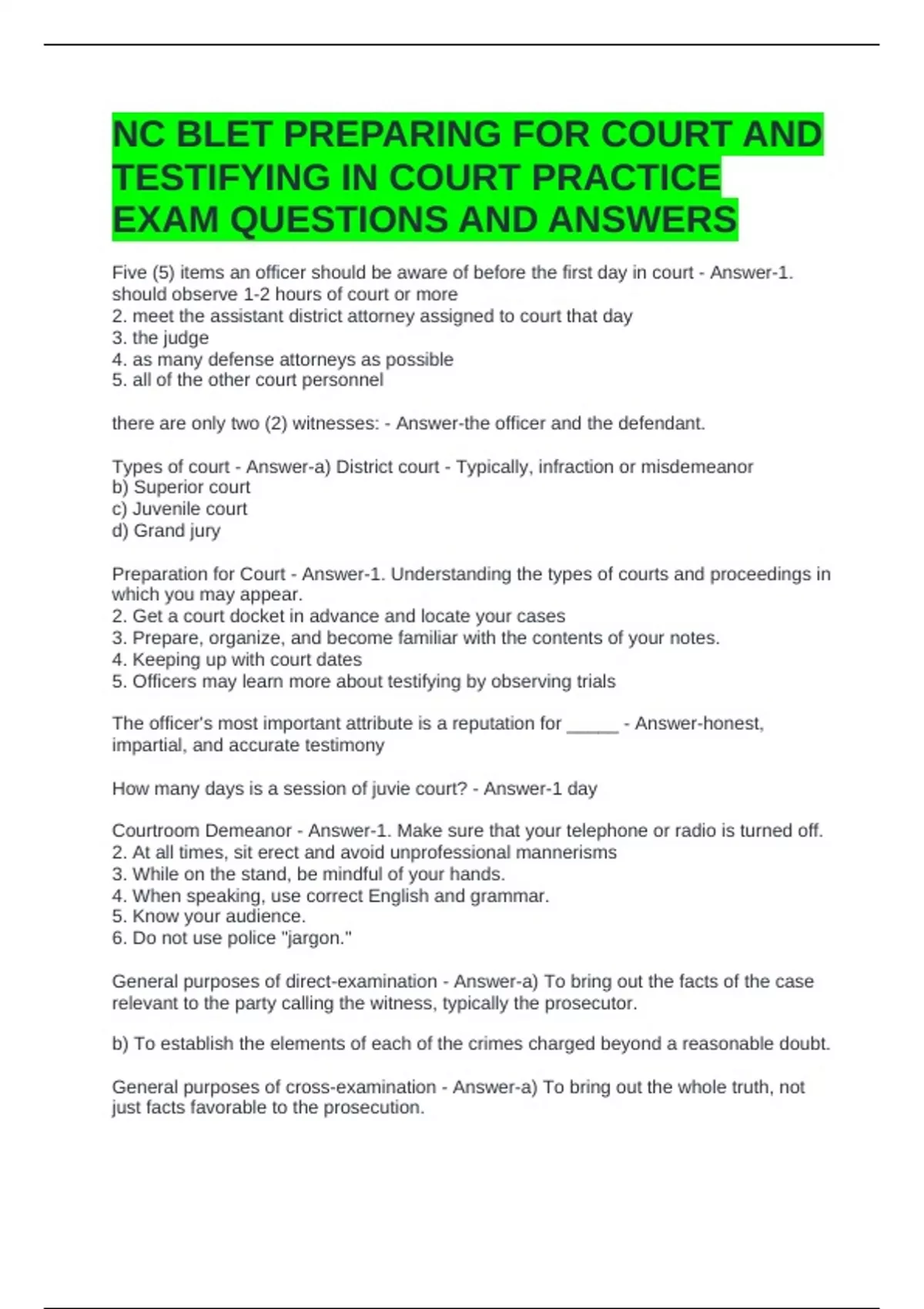 Five (5) items an officer should be aware of before the first day in court - Answer-1.