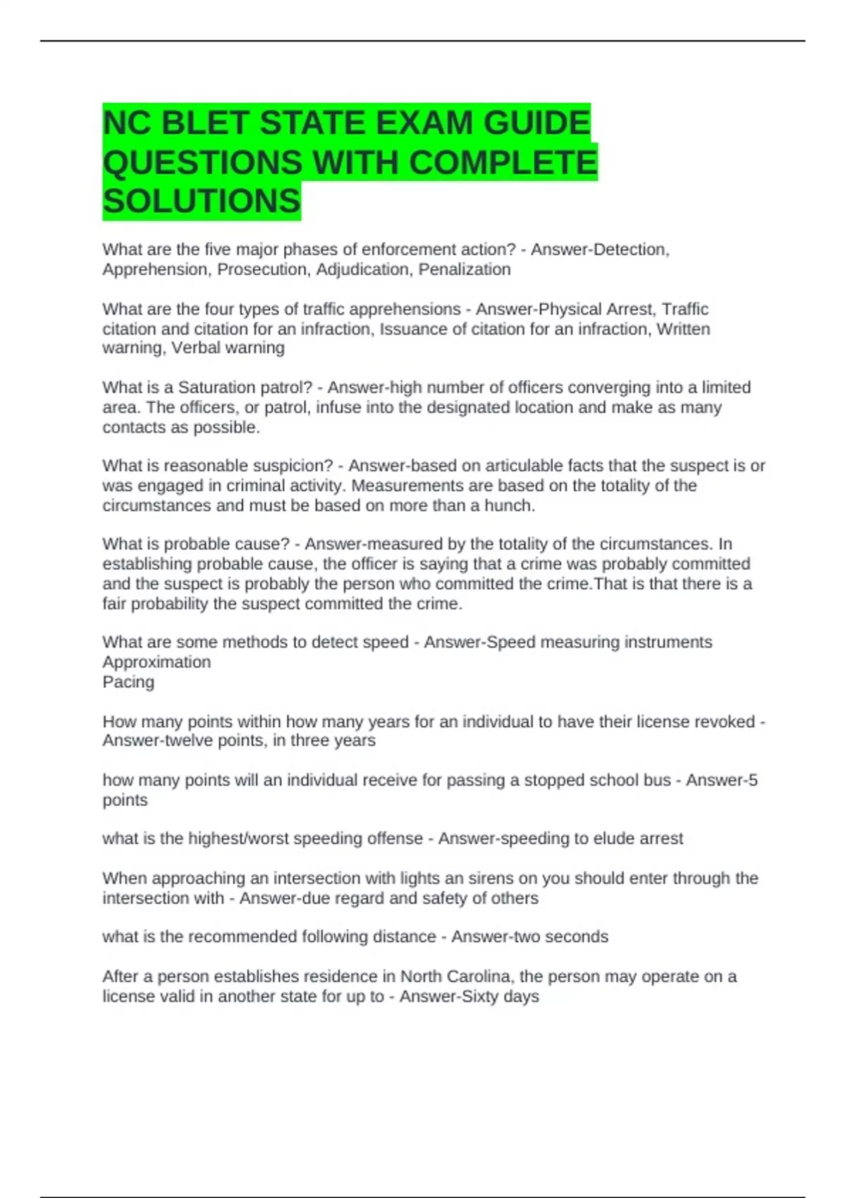 NC BLET STATE EXAM GUIDE QUESTIONS WITH COMPLETE SOLUTIONS