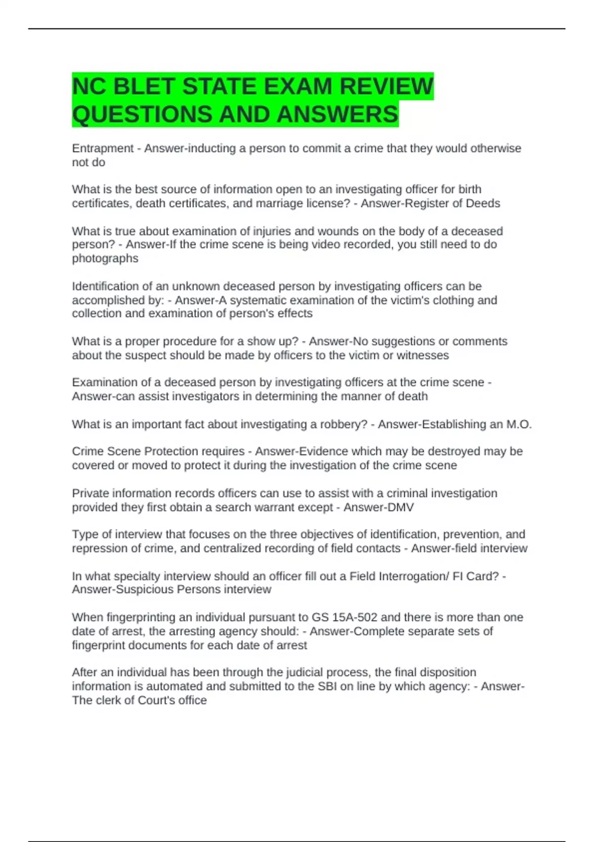 NC BLET STATE EXAM REVIEW QUESTIONS AND ANSWERS