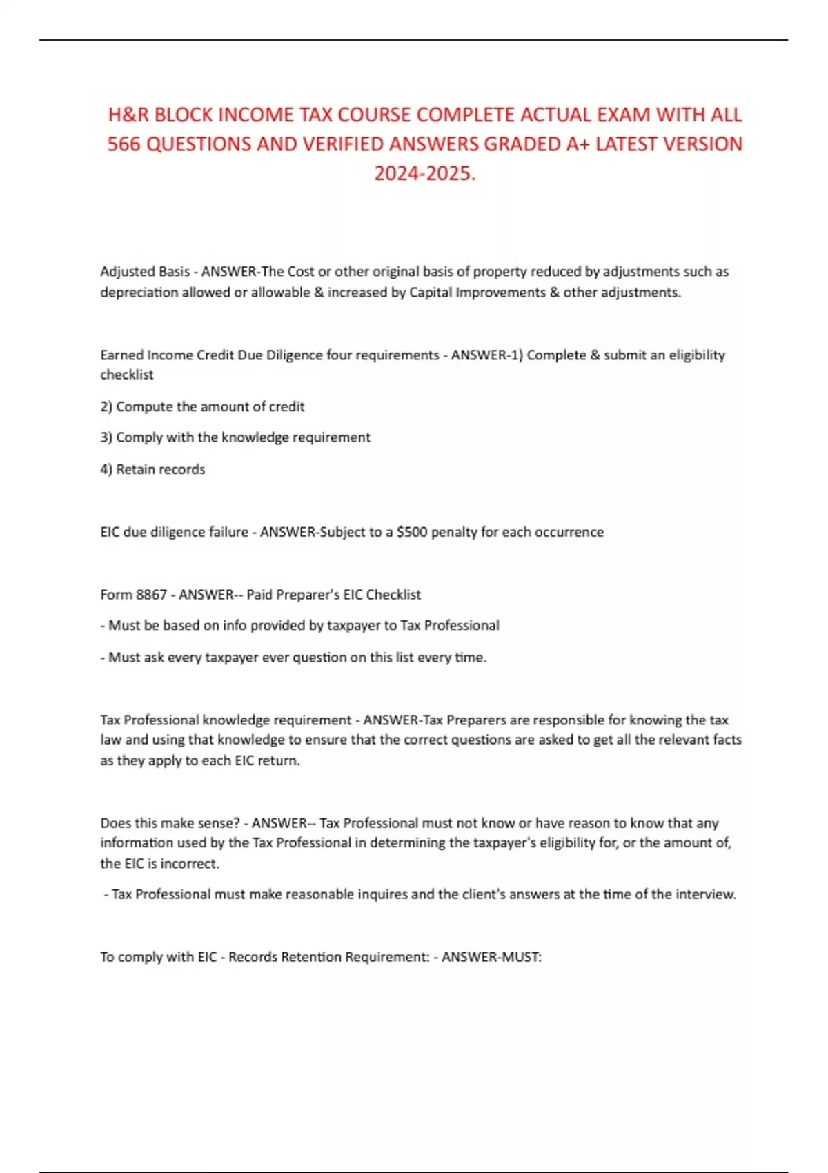 H&R BLOCK INCOME TAX COURSE COMPLETE ACTUAL EXAM WITH ALL