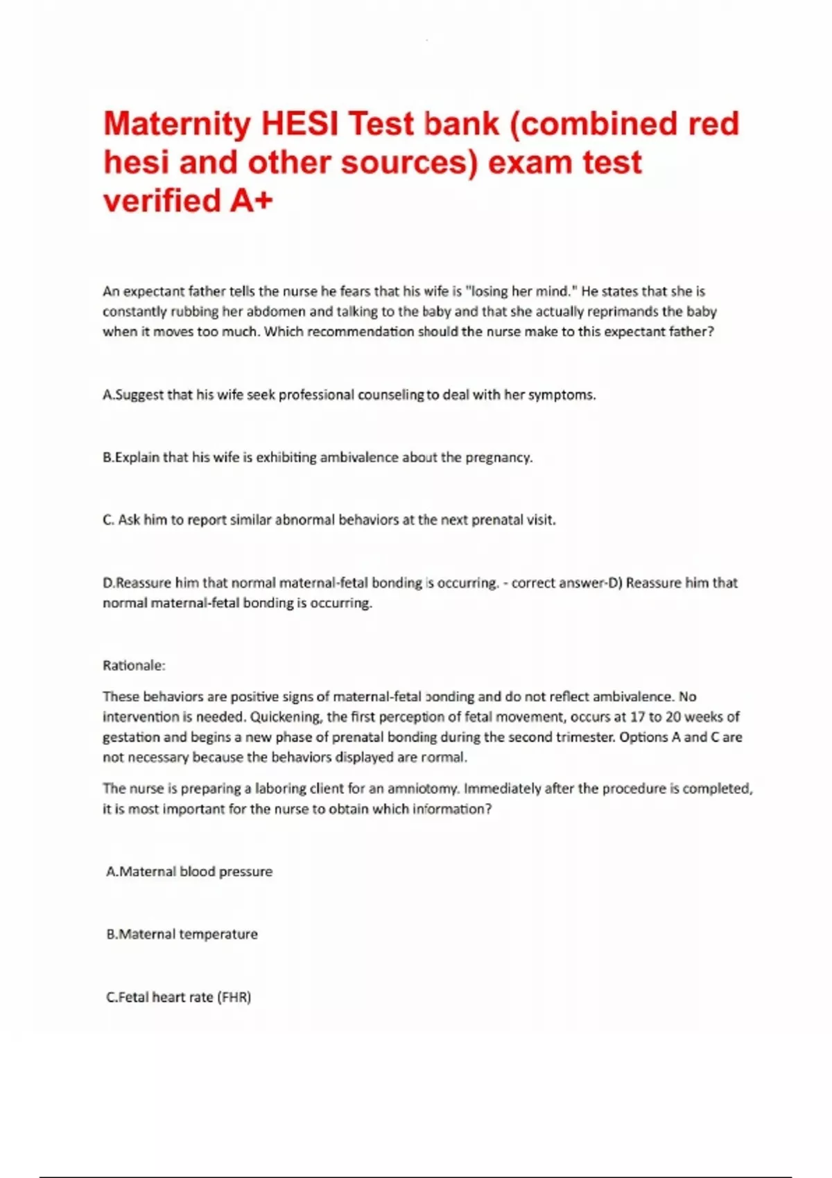 Maternity HESI Test bank (combined red hesi and other sources) exam test verified A+Maternity HESI Test bank (combined red hesi and other sources) exam test verified A+ An expectant father tells the nurse he fears that his wife is "losing her mind." He states that she is constantly rubbing her abdomen and talking to the baby and that she actually reprimands the baby when it moves too much. Which recommendation should the nurse make to this expectant father? A.Suggest that his wife seek professional counseling to deal with her symptoms. B.Explain that his wife is exhibiting ambivalence about the pregnancy. C. Ask him to report similar abnormal behaviors at the next prenatal visit. D.Reassure him that normal maternal-fetal bonding is occurring. - correct answer-D) Reassure him that normal maternal-fetal bonding is occurring. Rationale: These behaviors are positive signs of maternal-fetal bonding and do not reflect ambivalence. No intervention is needed. Quickening, the first perception of fetal movement, occurs at 17 to 20 weeks of gestation and begins a new phase of prenatal bonding during the second trimester. Options A and C are not necessary because the behaviors displayed are normal. The nurse is preparing a laboring client for an amniotomy. Immediately after the procedure is completed, it is most important for the nurse to obtain which information? A.Maternal blood pressure B.Maternal temperature C.Fetal heart rate (FHR) D.White blood cell count (WBC) - correct answer-C. Fetal heart rate (FHR) Rationale: The FHR should be assessed before and after the procedure to detect changes that may indicate the presence of cord compression or prolapse. An amniotomy (artificial rupture of membranes [AROM]) is used to stimulate labor when the condition of the cervix is favorable. The fluid should be assessed for color, odor, and consistency. Option A should be assessed every 15 to 20 minutes during labor but is not specific for AROM. Option B is monitored hourly after the membranes are ruptured to detect the development of amnionitis. Option D should be determined for all clients in labor. A nurse receives a shift change report for a newborn who is 12 hours post-vaginal delivery. In developing a plan of care, the nurse should give the highest priority to which finding? A.Cyanosis of the hands and feet B.Skin color that is slightly jaundiced C.Tiny white papules on the nose or chin D.Red patches on the cheeks and trunk - correct answer-B. Skin color that is slightly jaundiced Rationale: Jaundice, a yellow skin coloration, is caused by elevated levels of bilirubin, which should be further evaluated in a newborn <24 hours old. Acrocyanosis (blue color of the hands and feet) is a common finding in newborns; it occurs because the capillary system is immature. Milia are small white papules present on the nose and chin that are caused by sebaceous gland blockage and disappear in a few weeks. Small red patches on the cheeks and trunk are called erythema toxicum neonatorum, a common finding in newborns. A breastfeeding postpartum client is diagnosed with mastitis, and antibiotic therapy is prescribed. Which instruction should the nurse provide to this client? A.Breastfeed the infant, ensuring that both breasts are completely emptied. B.Feed expressed breast milk to avoid the pain of the infant latching onto the infected breast. C.Breastfeed on the unaffected breast only until the mastitis subsides. D.Dilute expressed breast milk with sterile water to reduce the antibiotic effect on the infant. - correct answer-A.Breastfeed the infant, ensuring that both breasts are completely emptied. Rationale:Mastitis, caused by plugged milk ducts, is related to breast engorgement, and breastfeeding during mastitis facilitates the complete emptying of engorged breasts, eliminating the pressure on the inflamed breast tissue. Option B is less painful but does not facilitate complete emptying of the breast tissue. Option C will not relieve the engorgement on the affected side. Option D will not decrease antibiotic effects on the infant. A 38-week primigravida who works as a secretary and sits at a computer 8 hours each day tells the nurse that her feet have begun to swell. Which instruction will aid in the prevention of pooling of blood in the lower extremities? A.Wear support stockings. B.Reduce salt in the diet. C.Move about every hour. D.Avoid constrictive clothing. - correct answer-C.Move about every hour. Rationale: Pooling of blood in the lower extremities results from the enlarged uterus exerting pressure on the pelvic veins. Moving about every hour will relieve pressure on the pelvic veins and increase venous return. Option A would increase venous return from varicose veins in the lower extremities but would be of little help with swelling. Option B might be helpful with generalized edema but is not specific for edematous lower extremities. Option D does not address venous return, and there is no indication in the question that constrictive clothing is a problem. Twenty-four hours after admission to the newborn nursery, a full-term male infant develops localized swelling on the right side of his head. In a newborn, what is the most likely cause of this accumulation of blood between the periosteum and skull that does not cross the suture line? A.Cephalhematoma, which is caused by forceps trauma B.Subarachnoid hematoma, which requires immediate drainage C.Molding, which is caused by pressure during labor D.Subdural hematoma, which can result in lifelong damage - correct answer-A.Cephalhematoma, which is caused by forceps trauma Rationale: Cephalhematoma, a slight abnormal variation of the newborn, usually arises within the first 24 hours after delivery. Trauma from delivery causes capillary bleeding between the periosteum and skull. Option C is a cranial distortion lasting 5 to 7 days, caused by pressure on the cranium during vaginal delivery, and is a common variation of the newborn. Options B and D both involve int