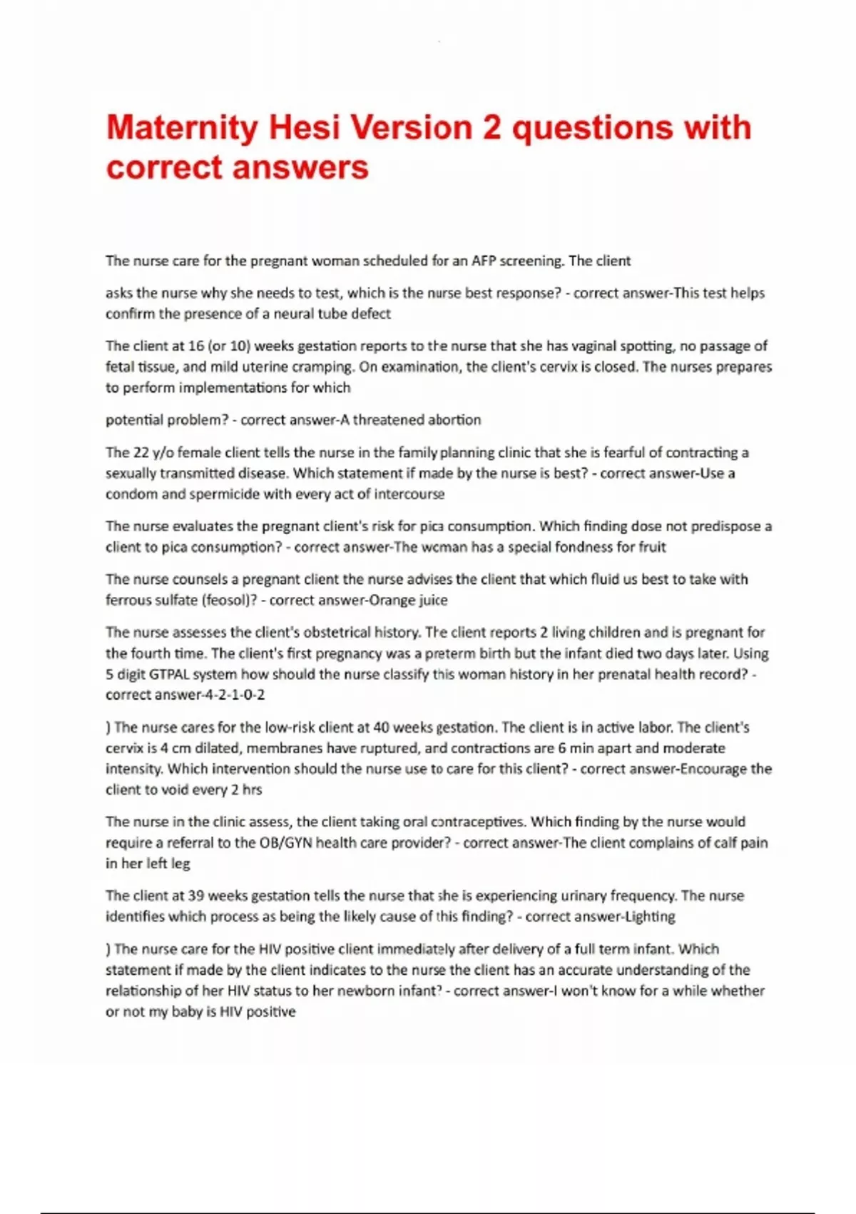 Maternity Hesi Version 2 questions with correct answersMaternity Hesi Version 2 questions with correct answers The nurse care for the pregnant woman scheduled for an AFP screening. The client asks the nurse why she needs to test, which is the nurse best response? - correct answer-This test helps confirm the presence of a neural tube defect The client at 16 (or 10) weeks gestation reports to the nurse that she has vaginal spotting, no passage of fetal tissue, and mild uterine cramping. On examination, the client's cervix is closed. The nurses prepares to perform implementations for which potential problem? - correct answer-A threatened abortion The 22 y/o female client tells the nurse in the family planning clinic that she is fearful of contracting a sexually transmitted disease. Which statement if made by the nurse is best? - correct answer-Use a condom and spermicide with every act of intercourse The nurse evaluates the pregnant client's risk for pica consumption. Which finding dose not predispose a client to pica consumption? - correct answer-The woman has a special fondness for fruit The nurse counsels a pregnant client the nurse advises the client that which fluid us best to take with ferrous sulfate (feosol)? - correct answer-Orange juice The nurse assesses the client's obstetrical history. The client reports 2 living children and is pregnant for the fourth time. The client's first pregnancy was a preterm birth but the infant died two days later. Using 5 digit GTPAL system how should the nurse classify this woman history in her prenatal health record? - correct answer-4-2-1-0-2 ) The nurse cares for the low-risk client at 40 weeks gestation. The client is in active labor. The client's cervix is 4 cm dilated, membranes have ruptured, and contractions are 6 min apart and moderate intensity. Which intervention should the nurse use to care for this client? - correct answer-Encourage the client to void every 2 hrs The nurse in the clinic assess, the client taking oral contraceptives. Which finding by the nurse would require a referral to the OB/GYN health care provider? - correct answer-The client complains of calf pain in her left leg The client at 39 weeks gestation tells the nu