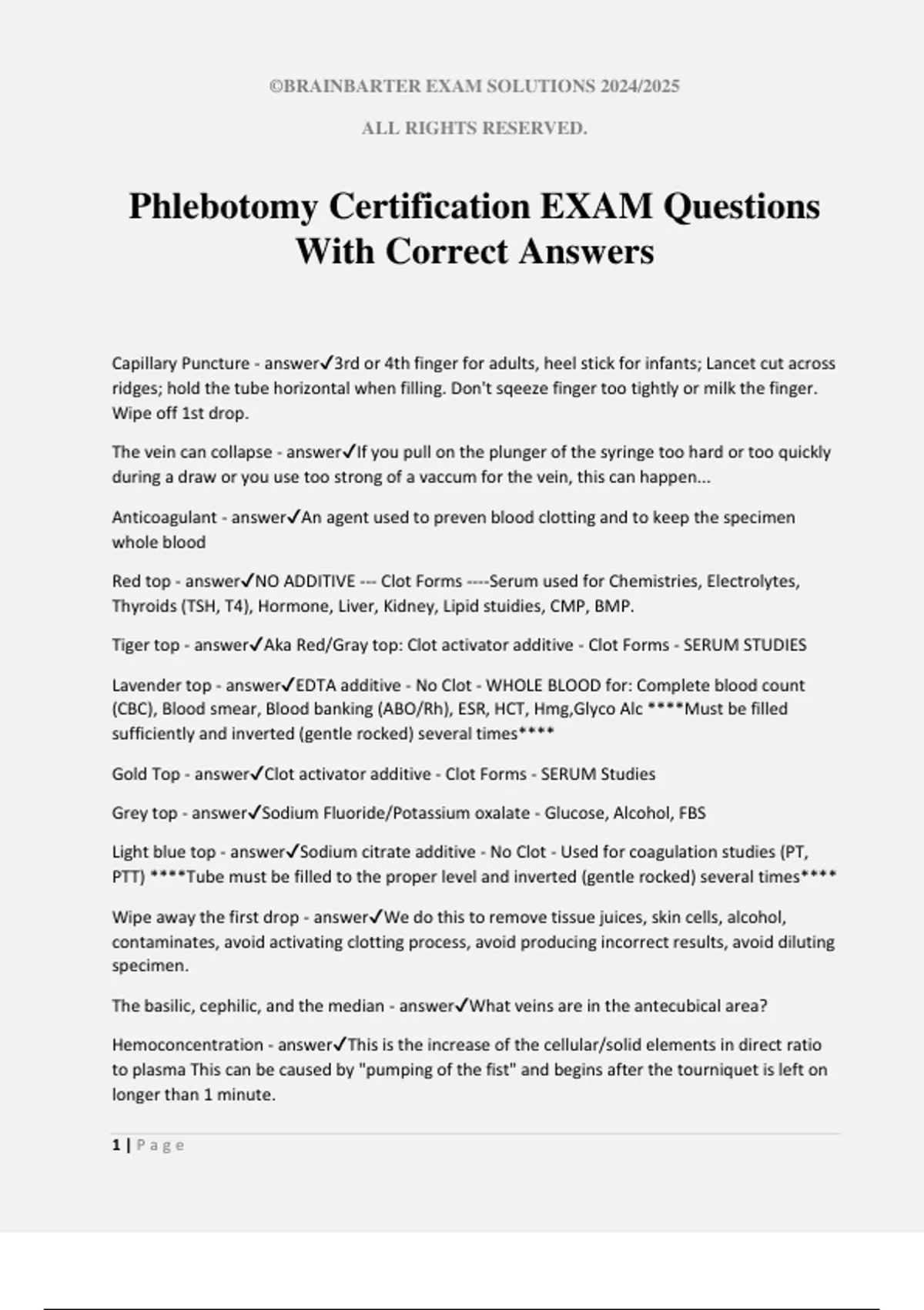 ©BRAINBARTER EXAM SOLUTIONS 2024/2025 ALL RIGHTS RESERVED. 1 | P a g e Phlebotomy Certification EXAM Questions With Correct Answers Capillary Puncture - answer3rd or 4th finger for adults, heel stick for infants; Lancet cut across ridges; hold the tube horizontal when filling. Don't sqeeze finger too tightly or milk the finger. Wipe off 1st drop. The vein can collapse - answerIf you pull on the plunger of the syringe too hard or too quickly during a draw or you use too strong of a vaccum for the vein, this can happen... Anticoagulant - answerAn agent used to preven blood clotting and to keep the specimen whole blood Red top - answerNO ADDITIVE --- Clot Forms ----Serum used for Chemistries, Electrolytes, Thyroids (TSH, T4), Hormone, Liver, Kidney, Lipid stuidies, CMP, BMP. Tiger top - answerAka Red/Gray top: Clot activator additive - Clot Forms - SERUM STUDIES Lavender top - answerEDTA additive - No Clot - WHOLE BLOOD for: Complete blood count (CBC), Blood smear, Blood banking (ABO/Rh), ESR, HCT, Hmg,Glyco Alc ****Must be filled sufficiently and inverted (gentle rocked) several times**** Gold Top - answerClot activator additive - Clot Forms - SERUM Studies Grey top - answerSodium Fluoride/Potassium oxalate - Glucose, Alcohol, FBS Light blue top - answerSodium citrate additive - No Clot - Used for coagulation studies (PT, PTT) ****Tube must be filled to the proper level and inverted (gentle rocked) several times**** Wipe away the first drop - answerWe do this to remove tissue juices, skin cells, alcohol, contaminates, avoid activating clotting process, avoid producing incorrect results, avoid diluting specimen. The basilic, cephilic, and the median - answerWhat veins are in the antecubical area? Hemoconcentration - answerThis is the increase of the cellular/solid elements in direct ratio to plasma This can be caused by "pumping of the fist" and begins after the tourniquet is left on longer than 1 minute.
