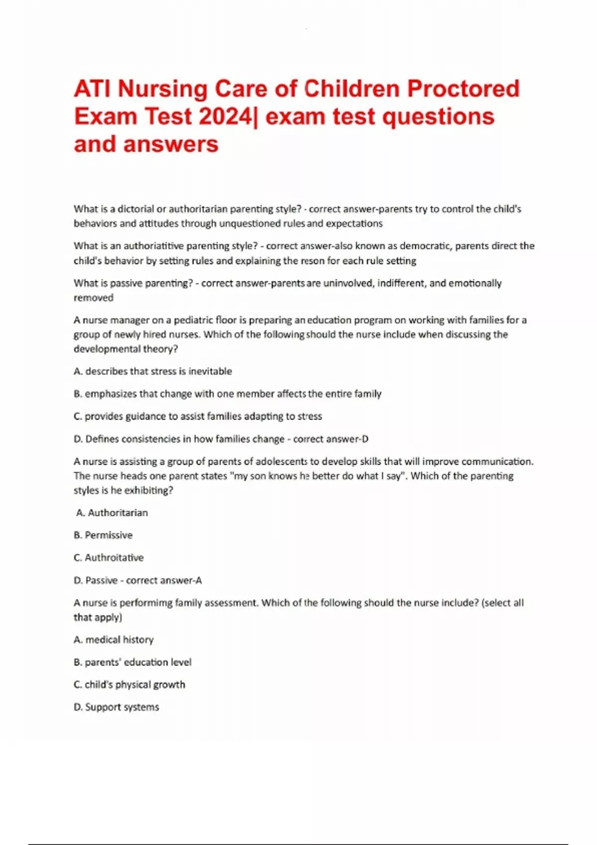 ATI Nursing Care of Children Proctored Exam Test 2024| exam test questions and answers