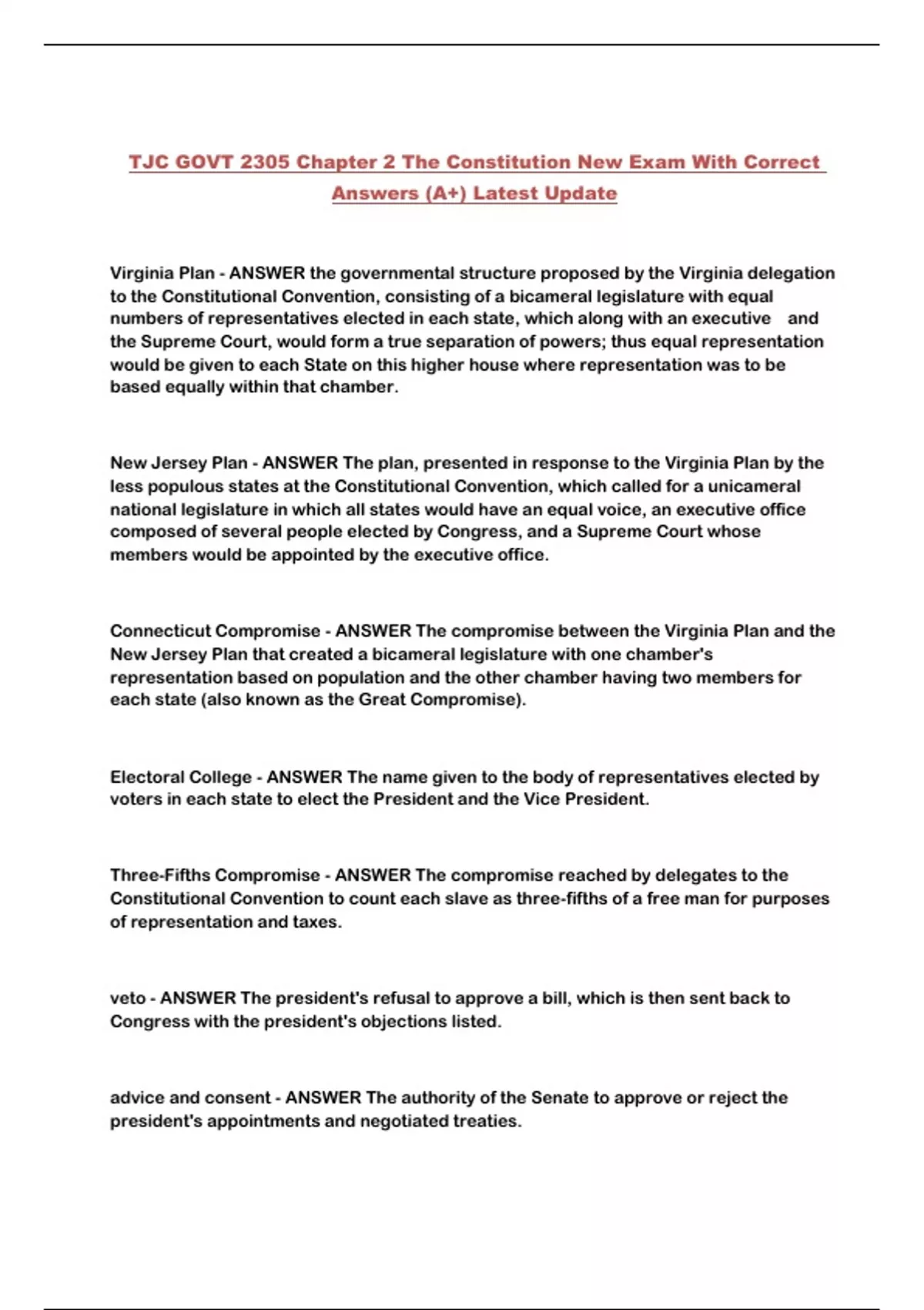 TJC GOVT 2305 Chapter 2 The Constitution New Exam With Correct Answers (A+) Latest Update...