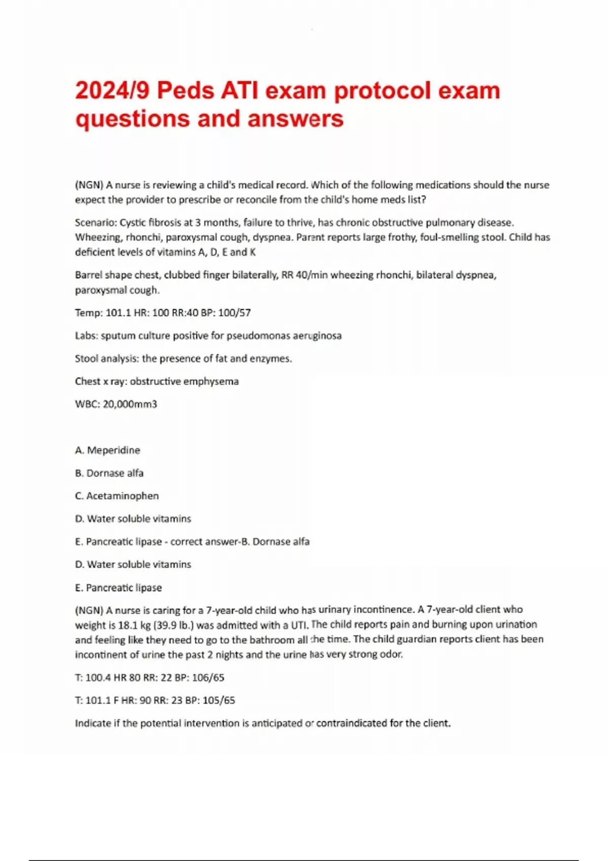 2024/9 Peds ATI exam protocol exam questions and answers2024/9 Peds ATI exam protocol exam questions and answers (NGN) A nurse is reviewing a child's medical record. Which of the following medications should the nurse expect the provider to prescribe or reconcile from the child's home meds list? Scenario: Cystic fibrosis at 3 months, failure to thrive, has chronic obstructive pulmonary disease. Wheezing, rhonchi, paroxysmal cough, dyspnea. Parent reports large frothy, foul-smelling stool. Child has deficient levels of vitamins A, D, E and K Barrel shape chest, clubbed finger bilaterally, RR 40/min wheezing rhonchi, bilateral dyspnea, paroxysmal cough. Temp: 101.1 HR: 100 RR:40 BP: 100/57 Labs: sputum culture positive for pseudomonas aeruginosa Stool analysis: the presence of fat and enzymes. Chest x ray: obstructive emphysema WBC: 20,000mm3 A. Meperidine B. Dornase alfa C. Acetaminophen D. Water soluble vitamins E. Pancreatic lipase - correct answer-B. Dornase alfa D. Water soluble vitamins E. Pancreatic lipase (NGN) A nurse is caring for a 7-year-old child who has urinary incontinence. A 7-year-old client who weight is 18.1 kg (39.9 lb.) was admitted with a UTI. The child reports pain and burning upon urination and feeling like they need to go to the bathroom all the time. The child guardian reports client has been incontinent of urine the past 2 nights and the urine has very strong odor. T: 100.4 HR 80 RR: 22 BP: 106/65 T: 101.1 F HR: 90 RR: 23 BP: 105/65 Indicate if the potential intervention is anticipated or contraindicated for the client. A. Educate the child about proper personal hygiene. B. Administer sulfamethoxazole and trimethronin. C. Administer salicylic acid for pain and fever. D. Ensure child receives a maximum of 1,200 mL/day of fluid. E. Advise child guardians about use of sunscreen. - correct answer-- Anticipated: A. Educate the child about proper personal hygiene. B. Administer sulfamethoxazole and trimethronin. E. Advise child guardians about use of sunscreen. - Contraindicated: C. Administer salicylic acid for pain and fever. D. Ensure child receives a maximum of 1,200 mL/day of fluid. (NGN) Child presents to ED guardian reports a child woke up coughing with a low-grade fever. Child alert restless in guardians' arms. RR easy. No cough noted. Child became agitated. Hoarse cry noted with audible inspiratory stridor. Barking non-productive cough present. 7:15 T: 100.6 98 o2 0800? T: 101 HR 112 RR: 24 o2 96 Assessment findings consistent with Acute Laryngotrancheobronchitis, or Pneumonia. A. Irritability B. Cough findings at 0800 C. Stridor D. Temperature - correct answer-- Acute Laryngotrancheobronchitis: A. Irritability B. Cough findings at 0800 C. Stridor D. Temperature - Pneumonia: B. Cough findings at 0800 D. Temperature (NGN) Received the child awake, alert, and crying. Parent noticed battery on control toy missing parent states child was drooling more than usual and witnessed gaging periodically. 0930 The child is lying on the parent's chest with eyes open and requesting sippy cups. He continues to have expiratory wheeze in bilateral upper lobes. Preparing child for diagnostic testing. Nurse should ---- followed by ----. A. Keep them NPO. B. Teach parents importance of inspecting Childs gasp area? C. Obtain informed consent. D. Prepare for flexible endoscopy. E. Monitor for return of gag reflex. F. Encourage parents to inspect toys for easily removable parts. - correct answer-A. Keep them NPO. D. Prepare for flexible endoscopy. The nurse is caring for a client who is postop following the placement of a halo vest to manage cervical fracture. Which actions should the nurse take? A. Tighten screws on halo device on-quarter turn every 48 hr. B. Reposition client using turning sheet. C. Encourage flexion and extension of neck. D. Assess pin sites for infection once every other day - correct answer-B. Reposition client using turning sheet. ED preparing to discharge 3-year-old The child's guardian states that the child has been unable to sleep recently and has been irritable. Guardian expresses concern about the child's atopic dermatitis worsening and the child scratching excessively, which results in the