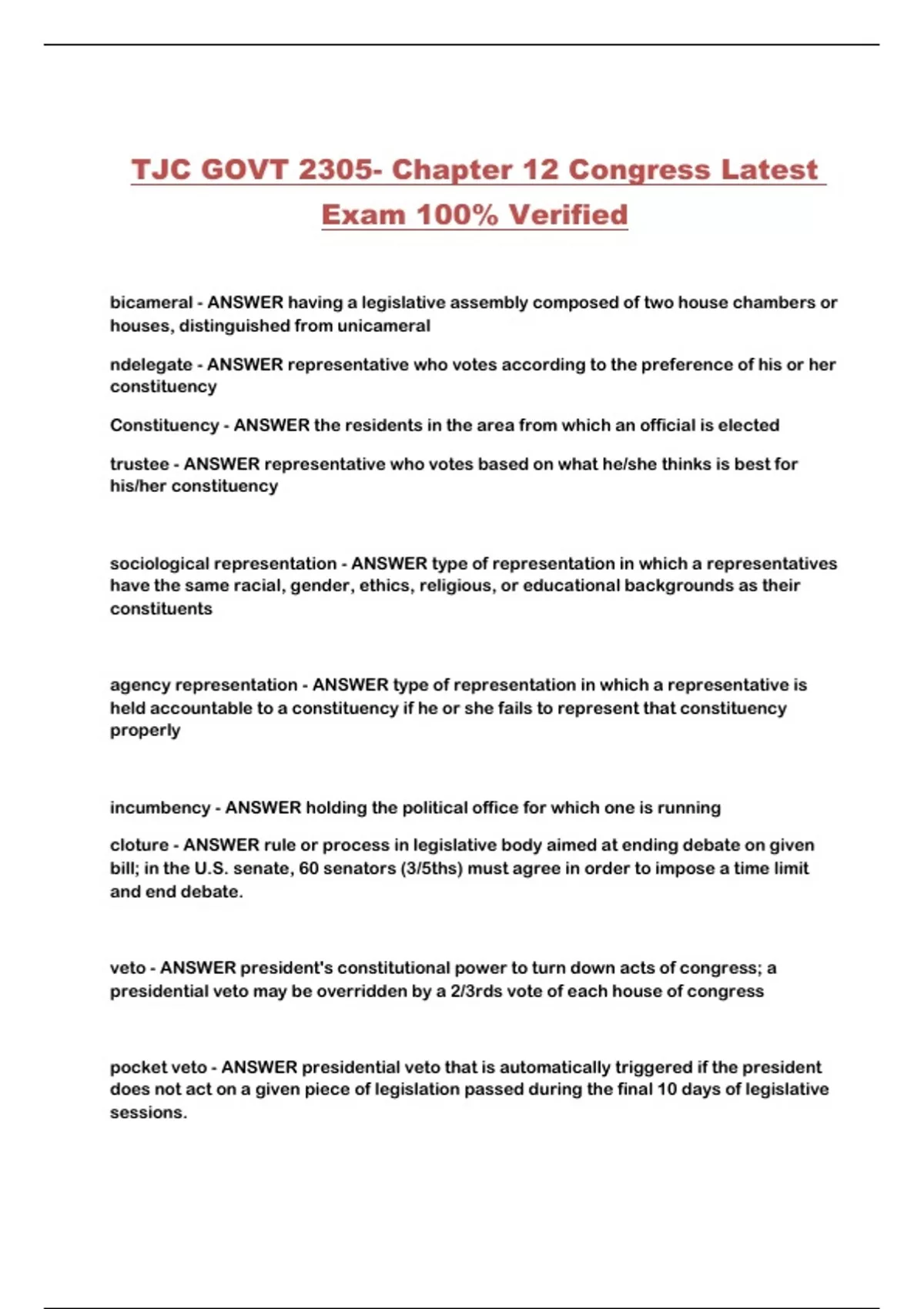 TJC GOVT 2305- Chapter 12 Congress Latest Exam 100% Verified...