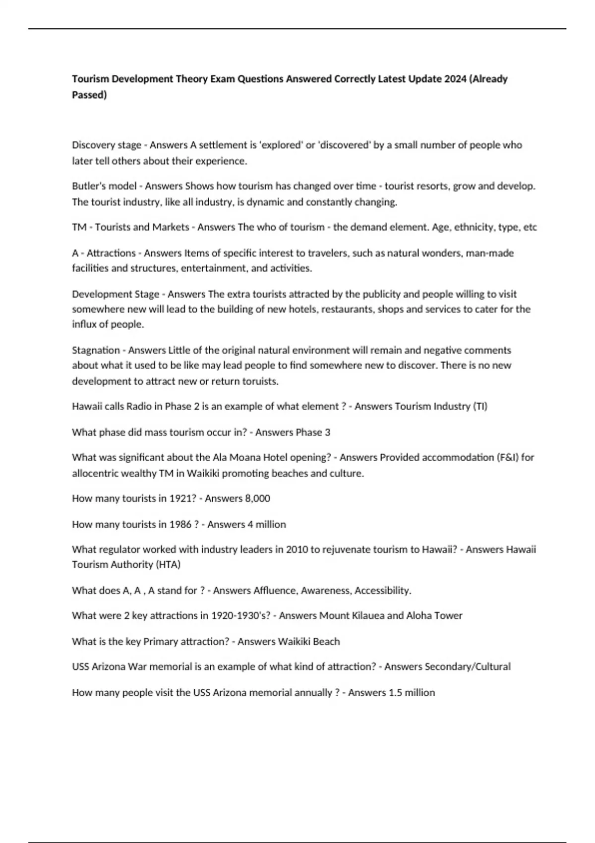 Tourism Development Theory Exam Questions Answered Correctly Latest Update 2024 (Already Passed) Discovery stage - Answers A settlement is 'explored' or 'discovered' by a small number of people who later tell others about their experience. Butler's model - Answers Shows how tourism has changed over time - tourist resorts, grow and develop. The tourist industry, like all industry, is dynamic and constantly changing. TM - Tourists and Markets - Answers The who of tourism - the demand element. Age, ethnicity, type, etc A - Attractions - Answers Items of specific interest to travelers, such as natural wonders, man-made facilities and structures, entertainment, and activities. Development Stage - Answers The extra tourists attracted by the publicity and people willing to visit somewhere new will lead to the building of new hotels, restaurants, shops and services to cater for the influx of people. Stagnation - Answers Little of the original natural environment will remain and negative comments about what it used to be like may lead people to find somewhere new to discover. There is no new development to attract new or return toruists. Hawaii calls Radio in Phase 2 is an example of what element ? - Answers Tourism Industry (TI) What phase did mass tourism occur in? - Answers Phase 3 What was significant about the Ala Moana Hotel opening? - Answers Provided accommodation (F&I) for allocentric wealthy TM in Waikiki promoting beaches and culture. How many tourists in 1921? - Answers 8,000 How many tourists in 1986 ? - Answers 4 million What regulator worked with industry leaders in 2010 to rejuvenate tourism to Hawaii? - Answers Hawaii Tourism Authority (HTA) What does A, A , A stand for ? - Answers Affluence, Awareness, Accessibility. What were 2 key attractions in 's? - Answers Mount Kilauea and Aloha Tower What is the key Primary attraction? - Answers Waikiki Beach USS Arizona War memorial is an example of what kind of attraction? - Answers Secondary/Cultural How many people visit the USS Arizona memorial annually ? - Answers 1.5 million Give and example of major PHASE 2 redevelopment. - Answers Ala Wai canal Built. A phase 2 interaction - Matheson Liners Steam Ships ->F &I - Answers Honolulu Hotel built Hawaiian Tourism Authority - Answers Is a regulator What did the Hawaiian Tourism Authority do during the rejuvenation phase? - Answers Strategic plan and marketing to drive demand (TI) Agglomeration - Answers Clumping together of industries for mutual advantage. Phase three catalyst event - Answers Cheaper flights What does FIT stand for? - Answers Free and Independent traveller Rapid tourism development and rapid growth - Answers Phase 3 In 1971 how many hotel rooms in Hawaii ? - Answers 32,000 Sunlust tourists - Answers tourists whose main activities revolve around the desire to relax in a pleasant environment, climate is a key factor. Allocentric Tourists - Answers tourists who are self-confident, curious, adventurous, outgoing and use travel as a way of expressing curiosity. Psychocentric tourists - Answers tourists who are anxious, self-inhibited, non-adventurous and prefer to travel in familiar surroundings. When did stagnation occur ? - Answers 1980s-2010 stagnation - Answers motionlessness; inactivity Honolulu City Council (regulator) - Answers Set a room cap of 39000 rooms During the stagnation stage there was diversification - Answers this is when you change or diversify into different demands or direction Specialised attractions in Hawaii - Answers ecotourism- rainforest walks, Specialised accommodation (F and I) - Answers Backpackers Activities developed outside Waikiki for FIT - Answers Hanauma Bay for snorkelling Activities developed outside Waikiki for FIT - Answers Turtle Bay resort rejuvenation - Answers Revitalizing - making new