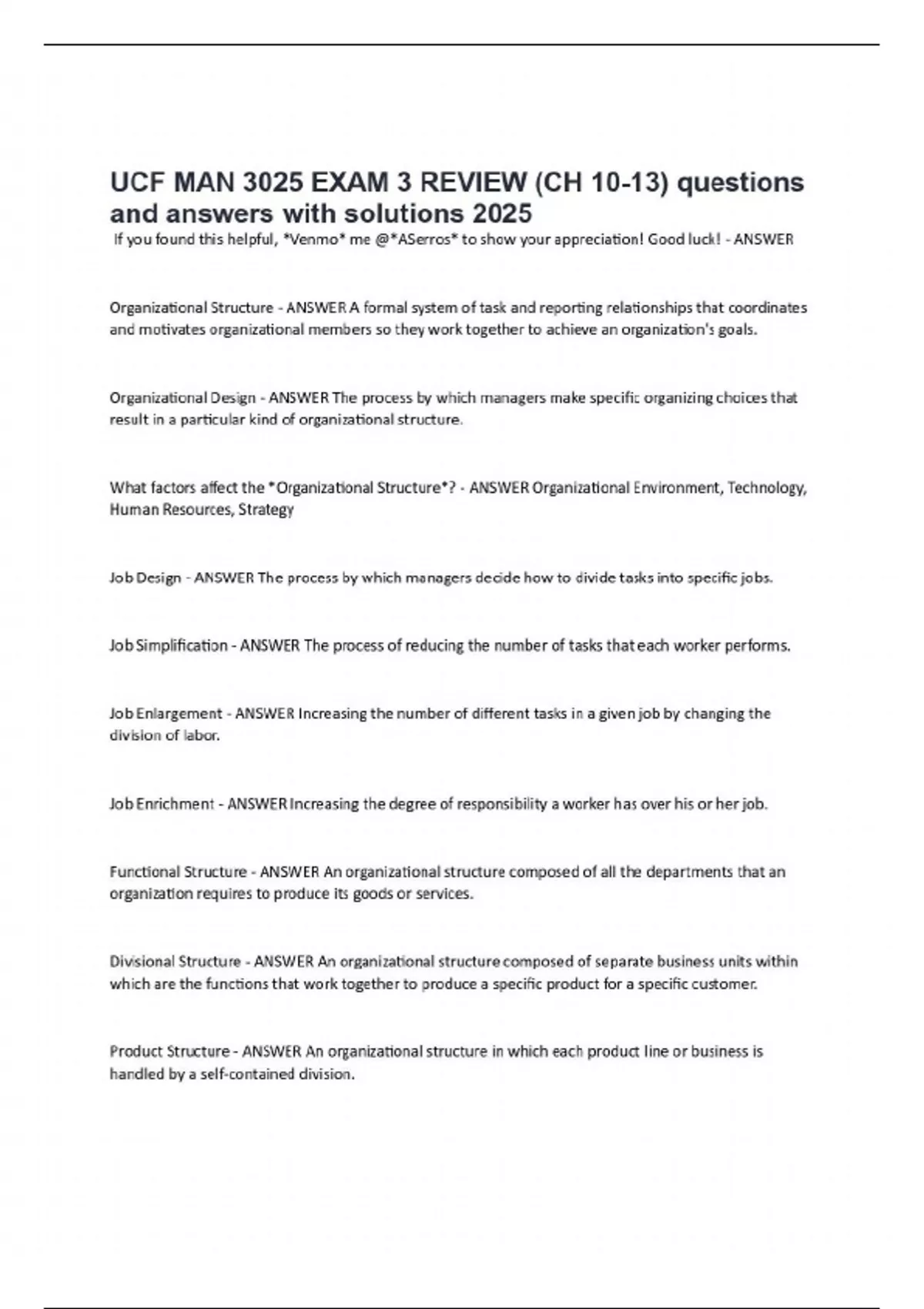 If you found this helpful, *Venmo* me @*ASerros* to show your appreciation! Good luck! - ANSWER Organizational Structure - ANSWER A formal system of task and reporting relationships that coordinates and motivates organizational members so they work together to achieve an organization's goals. Organizational Design - ANSWER The process by which managers make specific organizing choices that result in a particular kind of organizational structure. What factors affect the *Organizational Structure*? - ANSWER Organizational Environment, Technology, Human Resources, Strategy Job Design - ANSWER The process by which managers decide how to divide tasks into specific jobs. Job Simplification - ANSWER The process of reducing the number of tasks that each worker performs. Job Enlargement - ANSWER Increasing the number of different tasks in a given job by changing the division of labor. Job Enrichment - ANSWER Increasing the degree of responsibility a worker has over his or her job. Functional Structure - ANSWER An organizational structure composed of all the departments that an organization requires to produce its goods or services. Divisional Structure - ANSWER An organizational structure composed of separate business units within which are the functions that work together to produce a specific product for a specific customer. Product Structure - ANSWER An organizational structure in which each product line or business is handled by a self-contained division. Geographic Structure - ANSWER An organizational structure in which each region of a country or area of the world is served by a self-contained division. Market Structure - ANSWER An organizational structure in which each kind of customer is served by a self-contained division; a